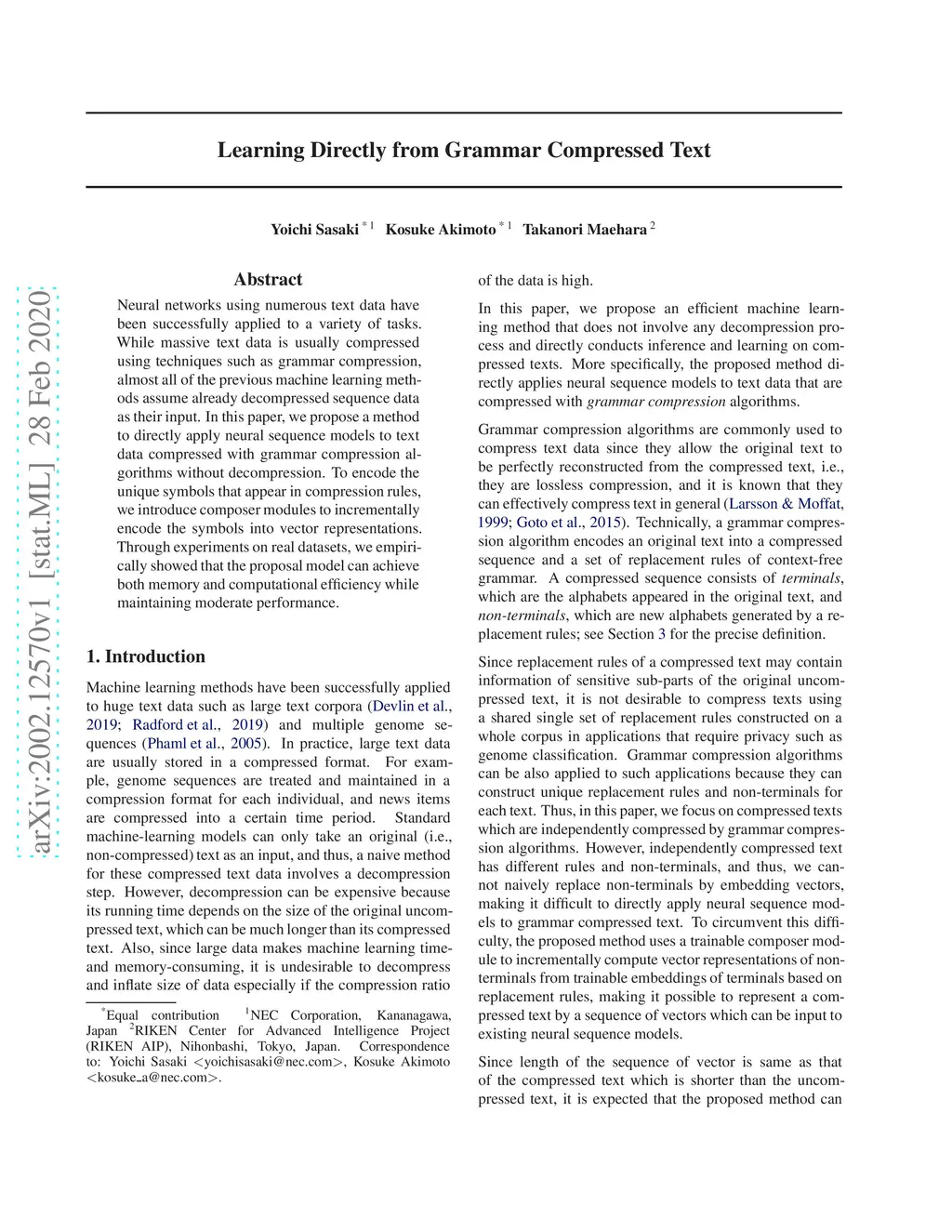 Neural networks using numerous text data have been successfully applied to a variety of tasks. While massive text data is usually compressed using techniques such as grammar compression, almost all of the previous machine learning methods assume already decompressed sequence data as their input. In this paper, we propose a method to directly apply neural sequence models to text data compressed with grammar compression algorithms without decompression. To encode the unique symbols that appear in compression rules, we introduce composer modules to incrementally encode the symbols into vector representations. Through experiments on real datasets, we empirically showed that the proposal model can achieve both memory and computational efficiency while maintaining moderate performance.
