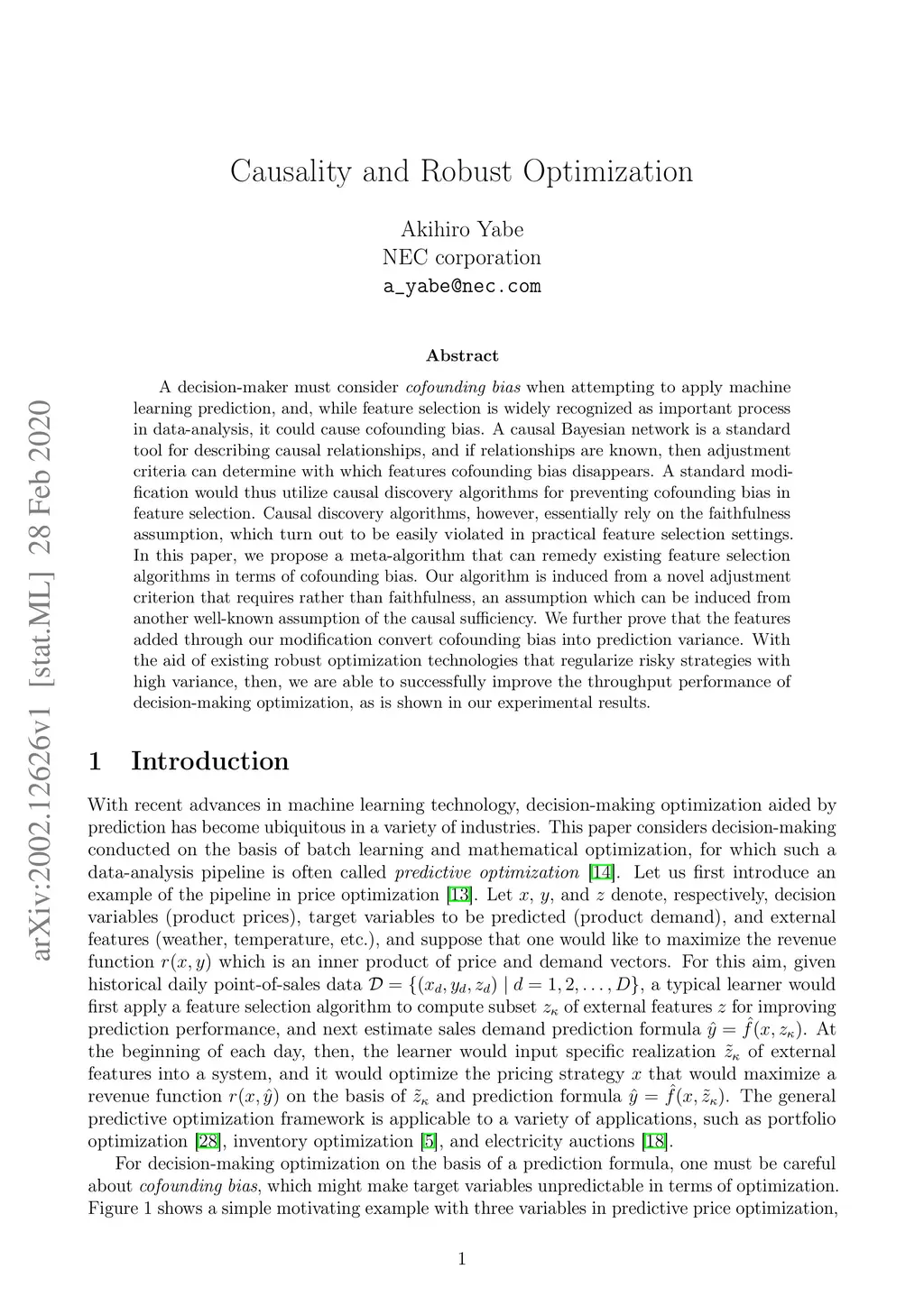 A decision-maker must consider cofounding bias when attempting to apply machine learning prediction, and, while feature selection is widely recognized as important process in data-analysis, it could cause cofounding bias. A causal Bayesian network is a standard tool for describing causal relationships, and if relationships are known, then adjustment criteria can determine with which features cofounding bias disappears. A standard modification would thus utilize causal discovery algorithms for preventing cofounding bias in feature selection. Causal discovery algorithms, however, essentially rely on the faithfulness assumption, which turn out to be easily violated in practical feature selection settings. In this paper, we propose a meta-algorithm that can remedy existing feature selection algorithms in terms of cofounding bias. Our algorithm is induced from a novel adjustment criterion that requires rather than faithfulness, an assumption which can be induced from another well-known assumption of the causal sufficiency. We further prove that the features added through our modification convert cofounding bias into prediction variance. With the aid of existing robust optimization technologies that regularize risky strategies with high variance, then, we are able to successfully improve the throughput performance of decision-making optimization, as is shown in our experimental results.