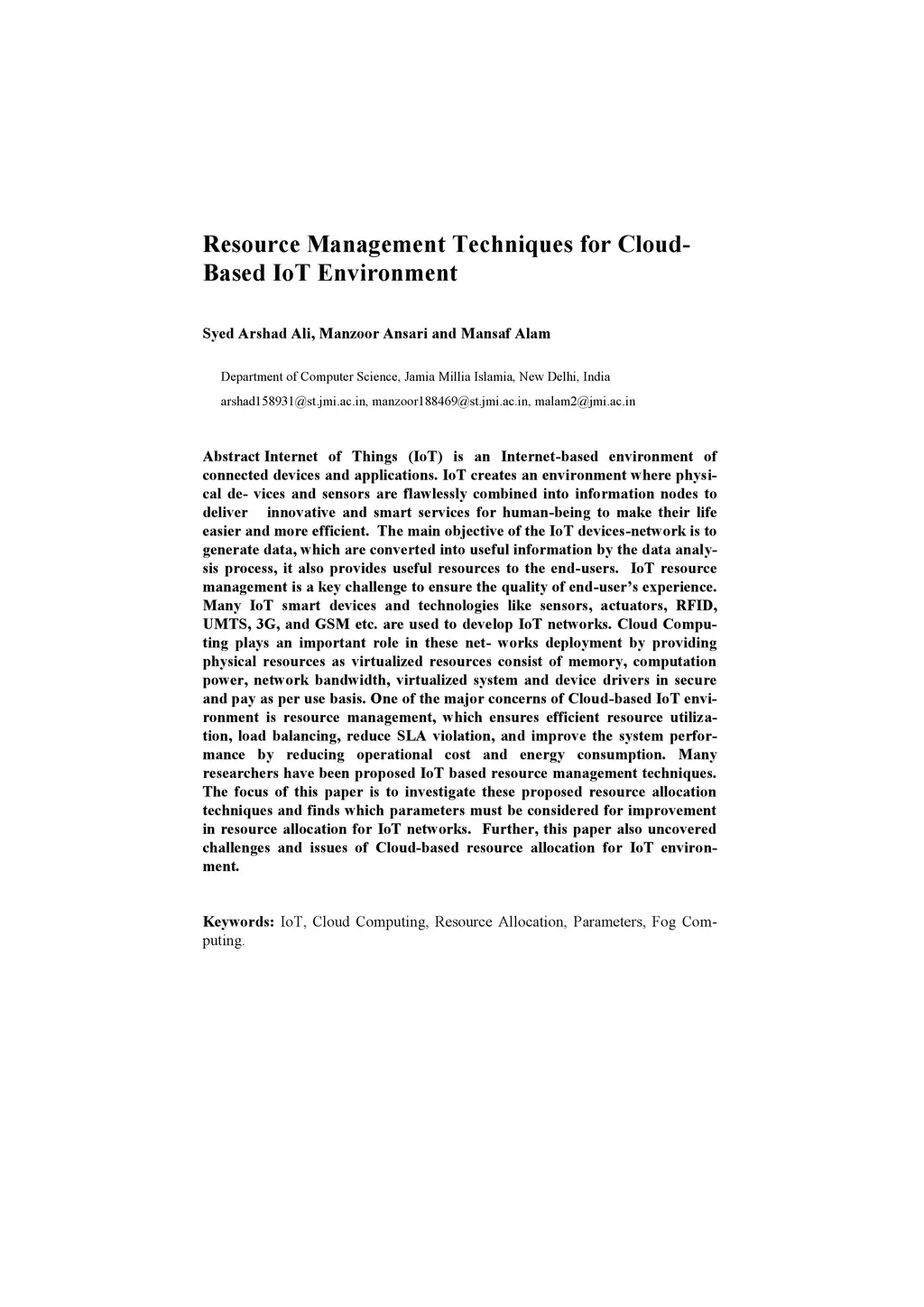 Resource Management Techniques for Cloud-Based IoT Environment