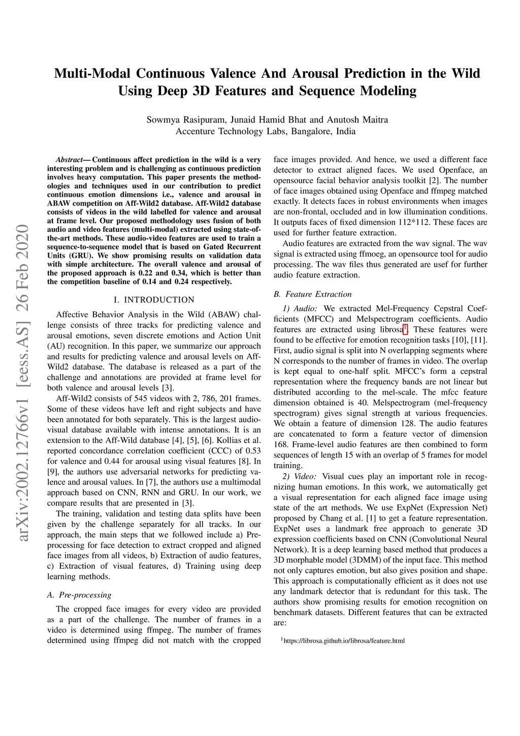 Continuous affect prediction in the wild is a very interesting problem and is challenging as continuous prediction involves heavy computation. This paper presents the methodologies and techniques used in our contribution to predict continuous emotion dimensions i.e., valence and arousal in ABAW competition on Aff-Wild2 database. Aff-Wild2 database consists of videos in the wild labelled for valence and arousal at frame level. Our proposed methodology uses fusion of both audio and video features (multi-modal) extracted using state-of-the-art methods. These audio-video features are used to train a sequence-to-sequence model that is based on Gated Recurrent Units (GRU). We show promising results on validation data with simple architecture. The overall valence and arousal of the proposed approach is 0.22 and 0.34, which is better than the competition baseline of 0.14 and 0.24 respectively.