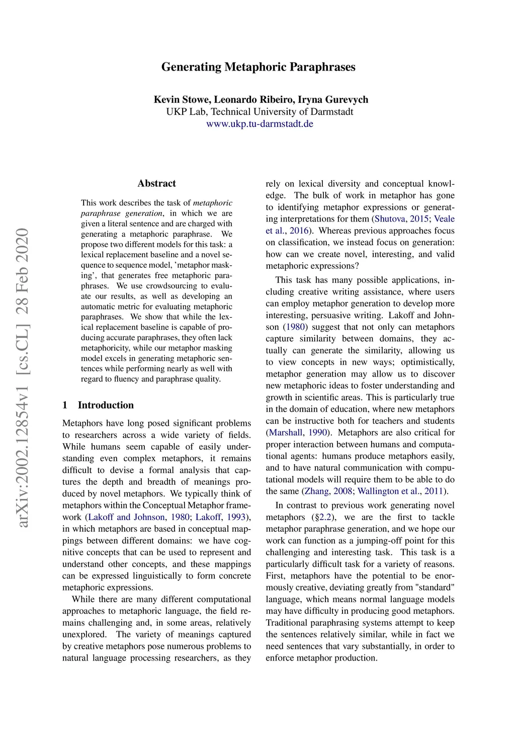 This work describes the task of metaphoric paraphrase generation, in which we are given a literal sentence and are charged with generating a metaphoric paraphrase. We propose two different models for this task: a lexical replacement baseline and a novel sequence to sequence model, 'metaphor masking', that generates free metaphoric paraphrases. We use crowdsourcing to evaluate our results, as well as developing an automatic metric for evaluating metaphoric paraphrases. We show that while the lexical replacement baseline is capable of producing accurate paraphrases, they often lack metaphoricity, while our metaphor masking model excels in generating metaphoric sentences while performing nearly as well with regard to fluency and paraphrase quality.