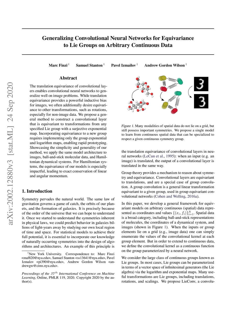 The translation equivariance of convolutional layers enables convolutional neural networks to generalize well on image problems. While translation equivariance provides a powerful inductive bias for images, we often additionally desire equivariance to other transformations, such as rotations, especially for non-image data. We propose a general method to construct a convolutional layer that is equivariant to transformations from any specified Lie group with a surjective exponential map. Incorporating equivariance to a new group requires implementing only the group exponential and logarithm maps, enabling rapid prototyping. Showcasing the simplicity and generality of our method, we apply the same model architecture to images, ball-and-stick molecular data, and Hamiltonian dynamical systems. For Hamiltonian systems, the equivariance of our models is especially impactful, leading to exact conservation of linear and angular momentum.