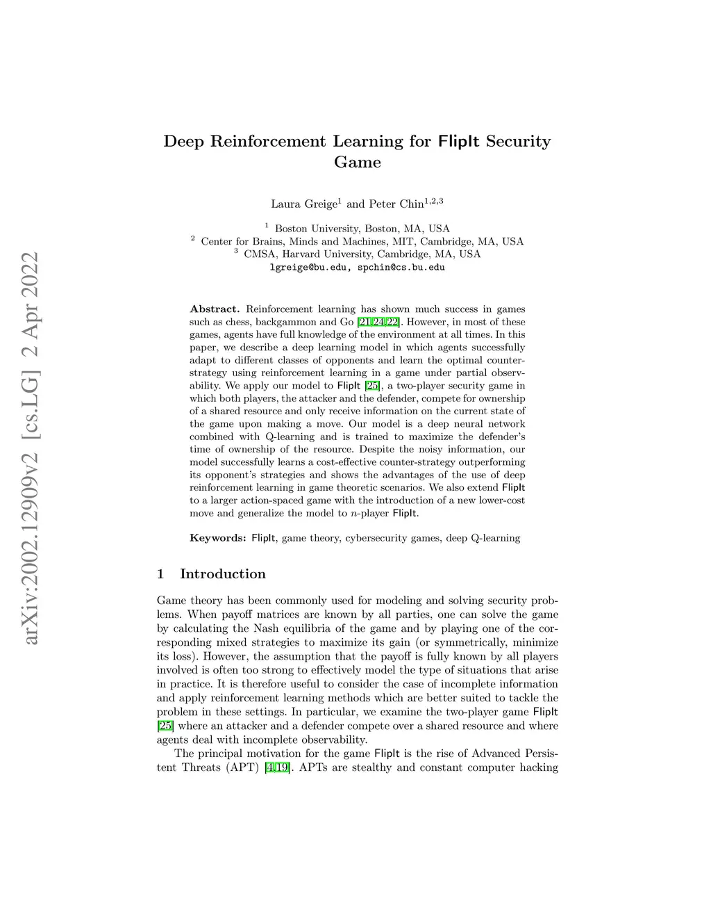 Reinforcement learning has shown much success in games such as chess, backgammon and Go. However, in most of these games, agents have full knowledge of the environment at all times. In this paper, we describe a deep learning model in which agents successfully adapt to different classes of opponents and learn the optimal counter-strategy using reinforcement learning in a game under partial observability. We apply our model to FlipIt, a two-player security game in which both players, the attacker and the defender, compete for ownership of a shared resource and only receive information on the current state of the game upon making a move. Our model is a deep neural network combined with Q-learning and is trained to maximize the defender's time of ownership of the resource. Despite the noisy information, our model successfully learns a cost-effective counter-strategy outperforming its opponent's strategies and shows the advantages of the use of deep reinforcement learning in game theoretic scenarios. We also extend FlipIt to a larger action-spaced game with the introduction of a new lower-cost move and generalize the model to -player FlipIt.