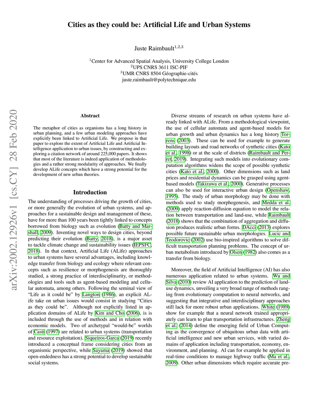 The metaphor of cities as organisms has a long history in urban planning, and a few urban modeling approaches have explicitly been linked to Artificial Life. We propose in that paper to explore the extent of Artificial Life and Artificial Intelligence application to urban issues, by constructing and exploring a citation network of around 225,000 papers. It shows that most of the literature is indeed application of methodologies and a rather strong modularity of approaches. We finally develop ALife concepts which have a strong potential for the development of new urban theories.