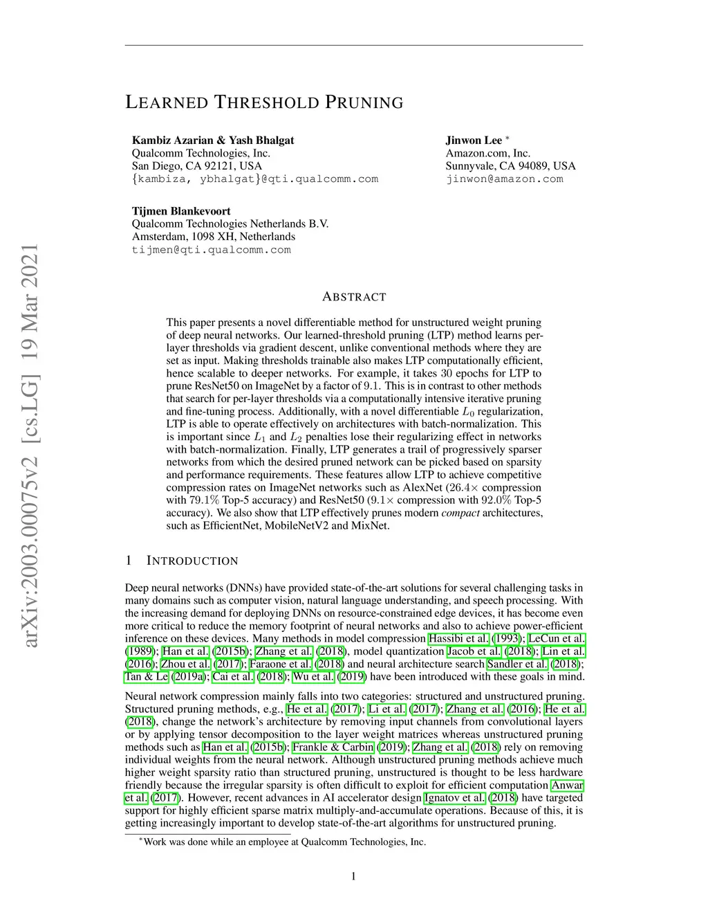 This paper presents a novel differentiable method for unstructured weight pruning of deep neural networks. Our learned-threshold pruning (LTP) method learns per-layer thresholds via gradient descent, unlike conventional methods where they are set as input. Making thresholds trainable also makes LTP computationally efficient, hence scalable to deeper networks. For example, it takes epochs for LTP to prune ResNet50 on ImageNet by a factor of . This is in contrast to other methods that search for per-layer thresholds via a computationally intensive iterative pruning and fine-tuning process. Additionally, with a novel differentiable regularization, LTP is able to operate effectively on architectures with batch-normalization. This is important since and penalties lose their regularizing effect in networks with batch-normalization. Finally, LTP generates a trail of progressively sparser networks from which the desired pruned network can be picked based on sparsity and performance requirements. These features allow LTP to achieve competitive compression rates on ImageNet networks such as AlexNet ( compression with Top-5 accuracy) and ResNet50 ( compression with Top-5 accuracy). We also show that LTP effectively prunes modern \textit{compact} architectures, such as EfficientNet, MobileNetV2 and MixNet.
