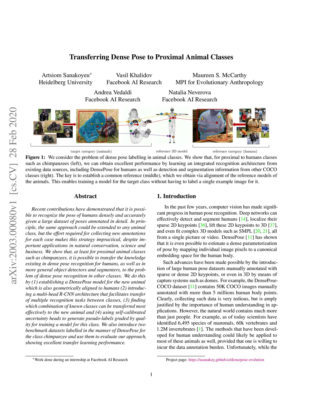 Recent contributions have demonstrated that it is possible to recognize the pose of humans densely and accurately given a large dataset of poses annotated in detail. In principle, the same approach could be extended to any animal class, but the effort required for collecting new annotations for each case makes this strategy impractical, despite important applications in natural conservation, science and business. We show that, at least for proximal animal classes such as chimpanzees, it is possible to transfer the knowledge existing in dense pose recognition for humans, as well as in more general object detectors and segmenters, to the problem of dense pose recognition in other classes. We do this by (1) establishing a DensePose model for the new animal which is also geometrically aligned to humans (2) introducing a multi-head R-CNN architecture that facilitates transfer of multiple recognition tasks between classes, (3) finding which combination of known classes can be transferred most effectively to the new animal and (4) using self-calibrated uncertainty heads to generate pseudo-labels graded by quality for training a model for this class. We also introduce two benchmark datasets labelled in the manner of DensePose for the class chimpanzee and use them to evaluate our approach, showing excellent transfer learning performance.