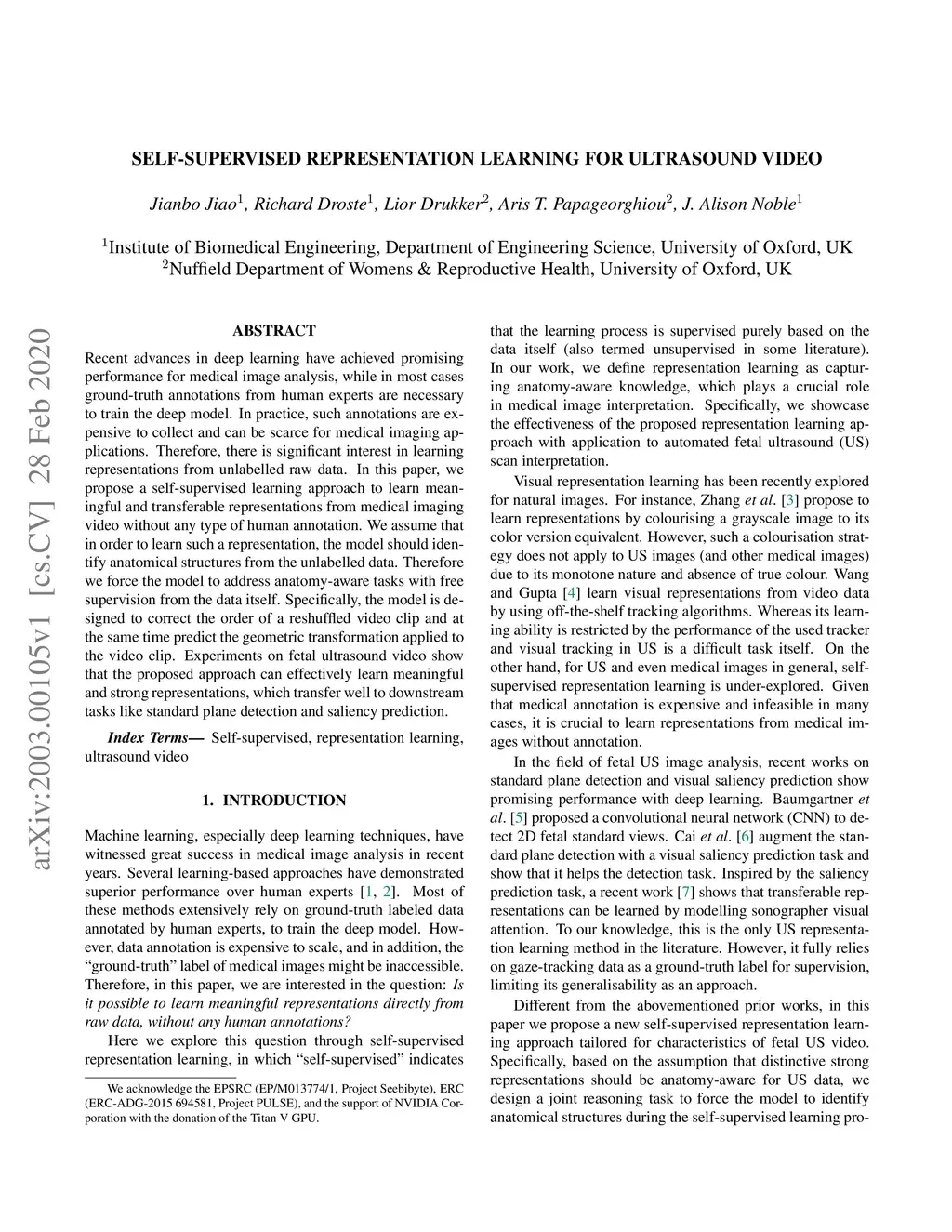 Recent advances in deep learning have achieved promising performance for medical image analysis, while in most cases ground-truth annotations from human experts are necessary to train the deep model. In practice, such annotations are expensive to collect and can be scarce for medical imaging applications. Therefore, there is significant interest in learning representations from unlabelled raw data. In this paper, we propose a self-supervised learning approach to learn meaningful and transferable representations from medical imaging video without any type of human annotation. We assume that in order to learn such a representation, the model should identify anatomical structures from the unlabelled data. Therefore we force the model to address anatomy-aware tasks with free supervision from the data itself. Specifically, the model is designed to correct the order of a reshuffled video clip and at the same time predict the geometric transformation applied to the video clip. Experiments on fetal ultrasound video show that the proposed approach can effectively learn meaningful and strong representations, which transfer well to downstream tasks like standard plane detection and saliency prediction.