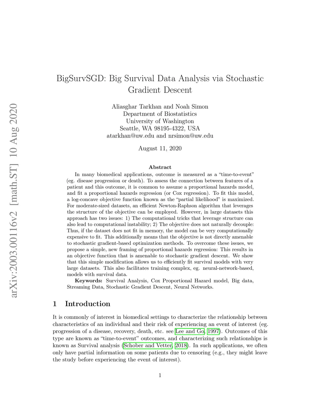 In many biomedical applications, outcome is measured as a ``time-to-event'' (eg. disease progression or death). To assess the connection between features of a patient and this outcome, it is common to assume a proportional hazards model, and fit a proportional hazards regression (or Cox regression). To fit this model, a log-concave objective function known as the ``partial likelihood'' is maximized. For moderate-sized datasets, an efficient Newton-Raphson algorithm that leverages the structure of the objective can be employed. However, in large datasets this approach has two issues: 1) The computational tricks that leverage structure can also lead to computational instability; 2) The objective does not naturally decouple: Thus, if the dataset does not fit in memory, the model can be very computationally expensive to fit. This additionally means that the objective is not directly amenable to stochastic gradient-based optimization methods. To overcome these issues, we propose a simple, new framing of proportional hazards regression: This results in an objective function that is amenable to stochastic gradient descent. We show that this simple modification allows us to efficiently fit survival models with very large datasets. This also facilitates training complex, eg. neural-network-based, models with survival data.