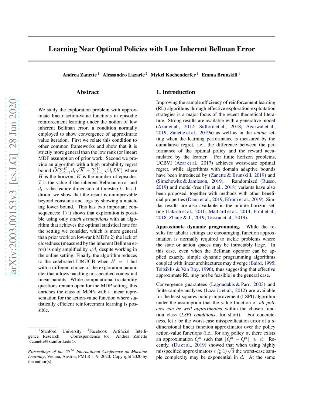 Learning Near Optimal Policies with Low Inherent Bellman Error