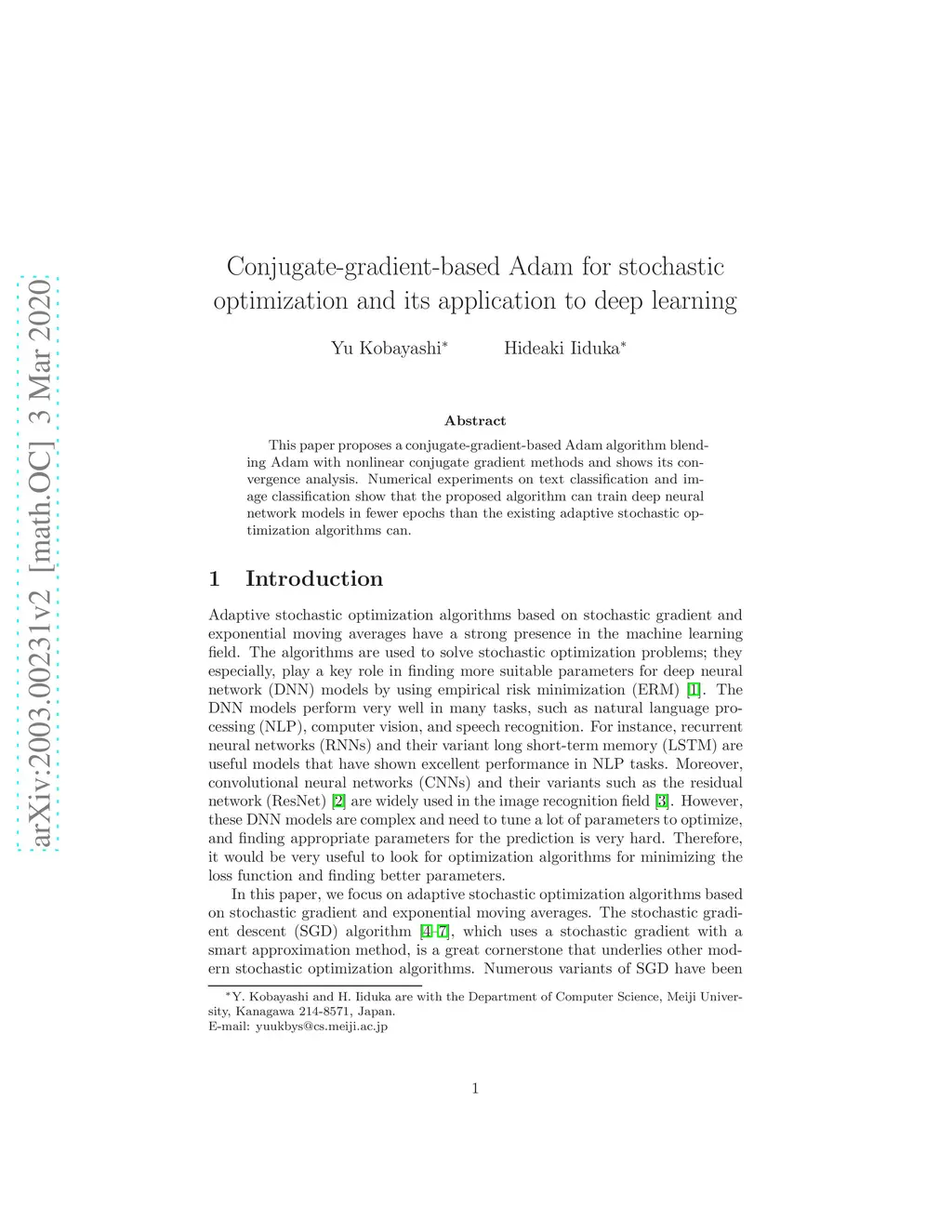 This paper proposes a conjugate-gradient-based Adam algorithm blending Adam with nonlinear conjugate gradient methods and shows its convergence analysis. Numerical experiments on text classification and image classification show that the proposed algorithm can train deep neural network models in fewer epochs than the existing adaptive stochastic optimization algorithms can.