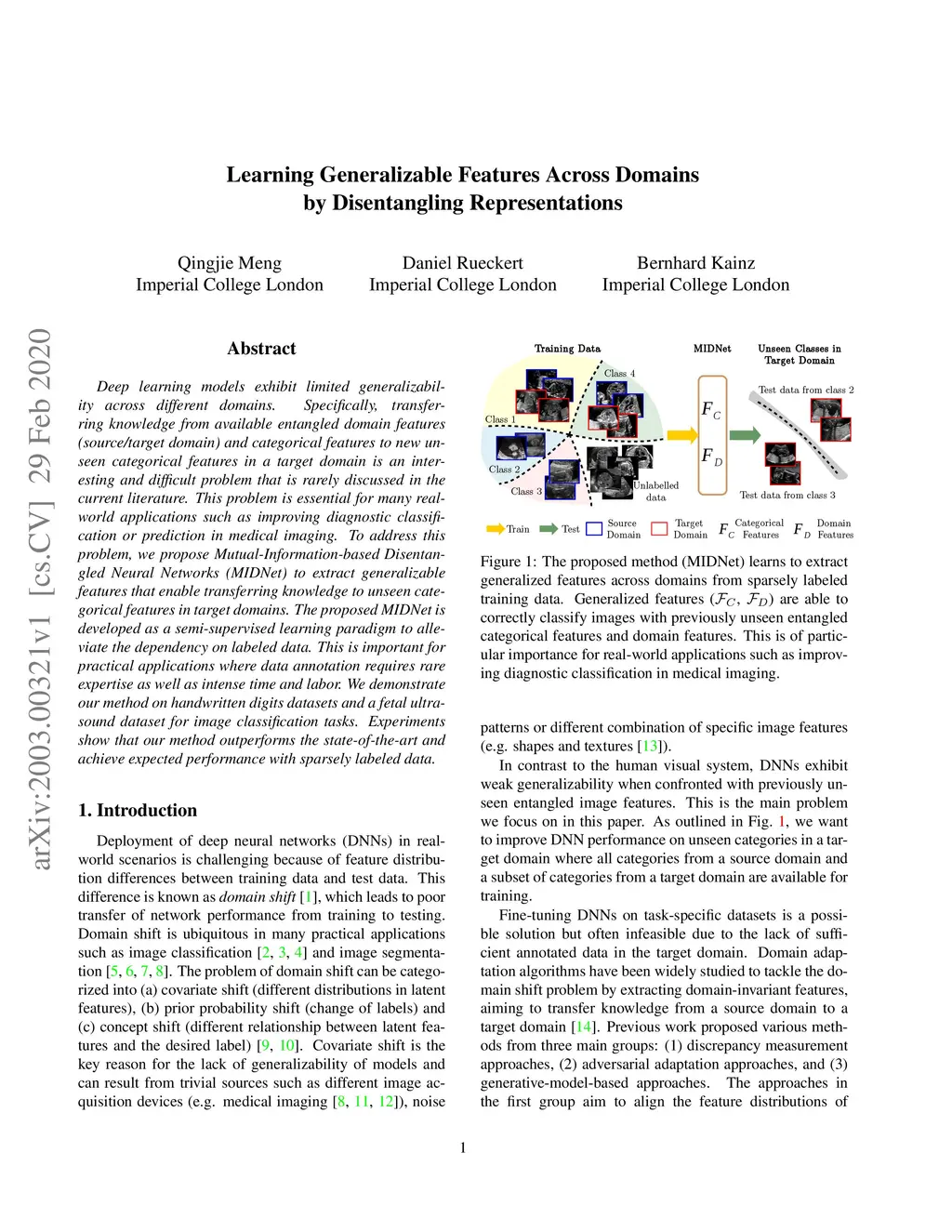Deep learning models exhibit limited generalizability across different domains. Specifically, transferring knowledge from available entangled domain features(source/target domain) and categorical features to new unseen categorical features in a target domain is an interesting and difficult problem that is rarely discussed in the current literature. This problem is essential for many real-world applications such as improving diagnostic classification or prediction in medical imaging. To address this problem, we propose Mutual-Information-based Disentangled Neural Networks (MIDNet) to extract generalizable features that enable transferring knowledge to unseen categorical features in target domains. The proposed MIDNet is developed as a semi-supervised learning paradigm to alleviate the dependency on labeled data. This is important for practical applications where data annotation requires rare expertise as well as intense time and labor. We demonstrate our method on handwritten digits datasets and a fetal ultrasound dataset for image classification tasks. Experiments show that our method outperforms the state-of-the-art and achieve expected performance with sparsely labeled data.