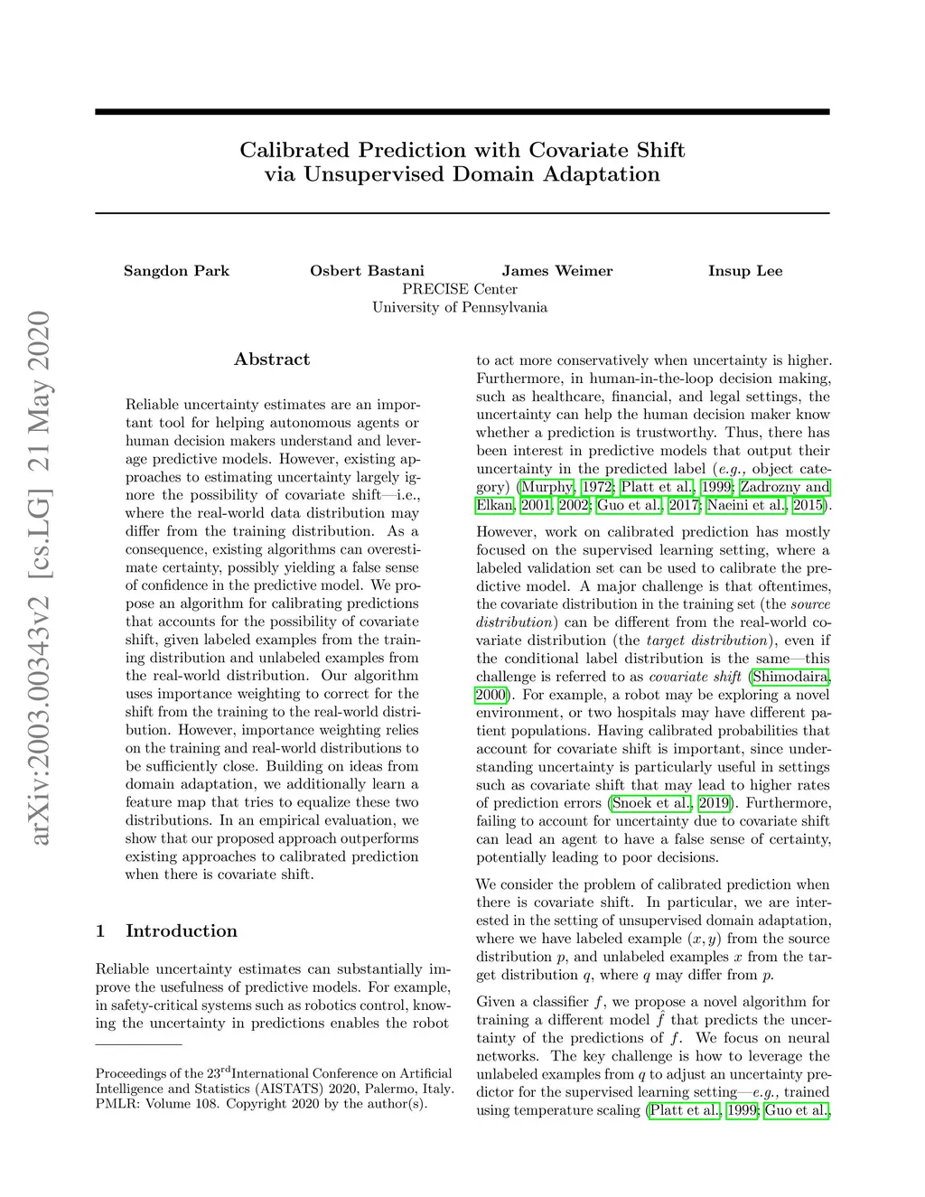 Reliable uncertainty estimates are an important tool for helping autonomous agents or human decision makers understand and leverage predictive models. However, existing approaches to estimating uncertainty largely ignore the possibility of covariate shift--i.e., where the real-world data distribution may differ from the training distribution. As a consequence, existing algorithms can overestimate certainty, possibly yielding a false sense of confidence in the predictive model. We propose an algorithm for calibrating predictions that accounts for the possibility of covariate shift, given labeled examples from the training distribution and unlabeled examples from the real-world distribution. Our algorithm uses importance weighting to correct for the shift from the training to the real-world distribution. However, importance weighting relies on the training and real-world distributions to be sufficiently close. Building on ideas from domain adaptation, we additionally learn a feature map that tries to equalize these two distributions. In an empirical evaluation, we show that our proposed approach outperforms existing approaches to calibrated prediction when there is covariate shift.