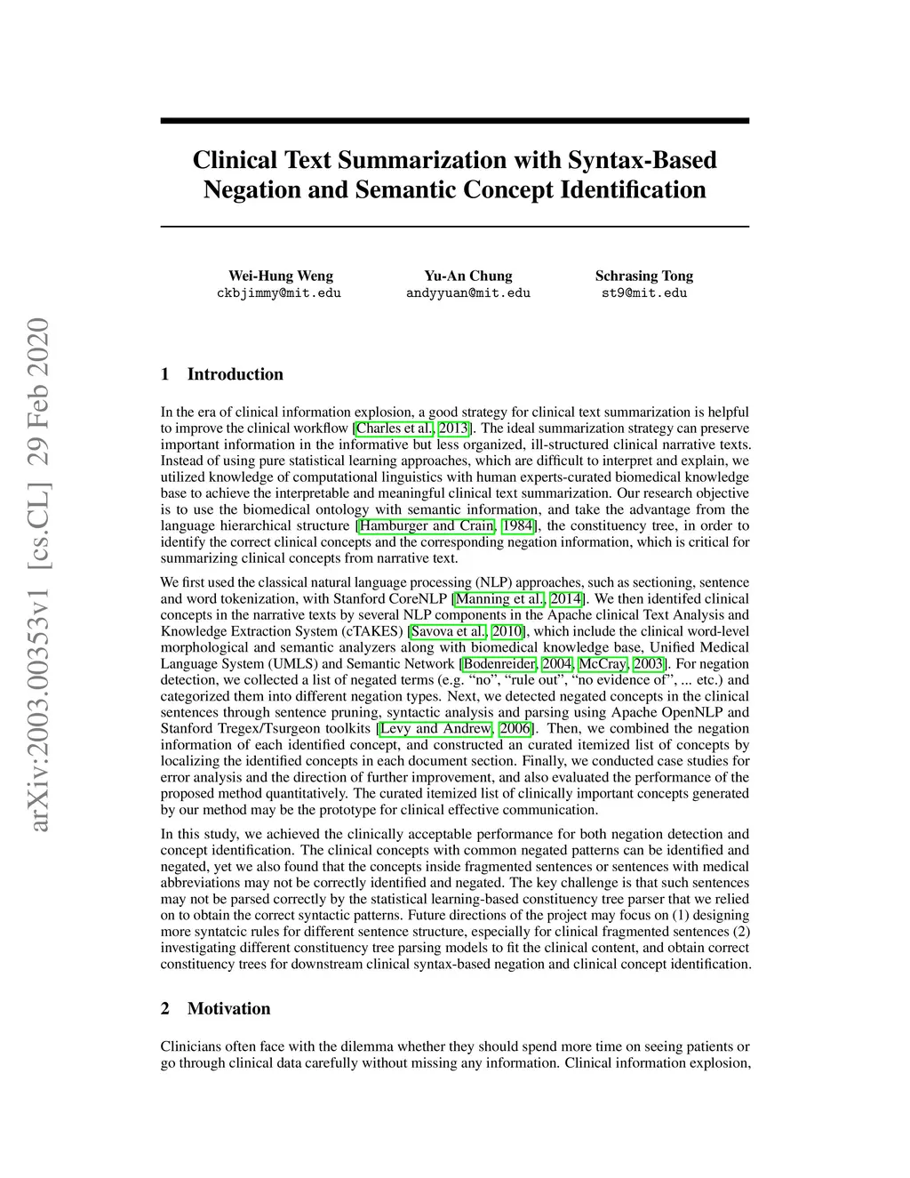 Clinical Text Summarization with Syntax-Based Negation and Semantic