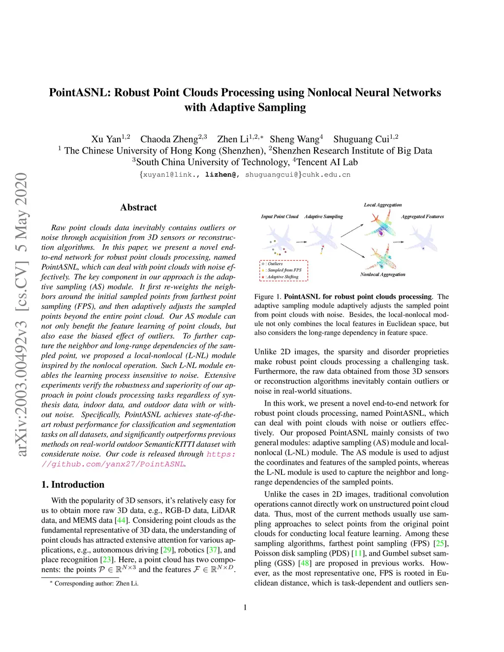 Raw point clouds data inevitably contains outliers or noise through acquisition from 3D sensors or reconstruction algorithms. In this paper, we present a novel end-to-end network for robust point clouds processing, named PointASNL, which can deal with point clouds with noise effectively. The key component in our approach is the adaptive sampling (AS) module. It first re-weights the neighbors around the initial sampled points from farthest point sampling (FPS), and then adaptively adjusts the sampled points beyond the entire point cloud. Our AS module can not only benefit the feature learning of point clouds, but also ease the biased effect of outliers. To further capture the neighbor and long-range dependencies of the sampled point, we proposed a local-nonlocal (L-NL) module inspired by the nonlocal operation. Such L-NL module enables the learning process insensitive to noise. Extensive experiments verify the robustness and superiority of our approach in point clouds processing tasks regardless of synthesis data, indoor data, and outdoor data with or without noise. Specifically, PointASNL achieves state-of-the-art robust performance for classification and segmentation tasks on all datasets, and significantly outperforms previous methods on real-world outdoor SemanticKITTI dataset with considerate noise. Our code is released through https://github.com/yanx27/PointASNL.