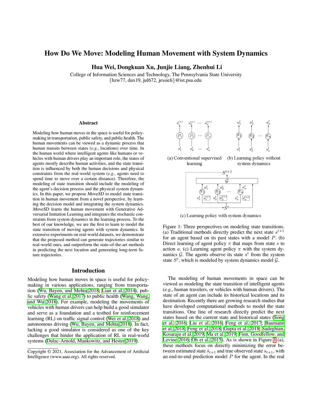 Modeling how human moves in the space is useful for policy-making in transportation, public safety, and public health. Human movements can be viewed as a dynamic process that human transits between states (\eg, locations) over time. In the human world where intelligent agents like humans or vehicles with human drivers play an important role, the states of agents mostly describe human activities, and the state transition is influenced by both the human decisions and physical constraints from the real-world system (\eg, agents need to spend time to move over a certain distance). Therefore, the modeling of state transition should include the modeling of the agent's decision process and the physical system dynamics. In this paper, we propose \ours to model state transition in human movement from a novel perspective, by learning the decision model and integrating the system dynamics. \ours learns the human movement with Generative Adversarial Imitation Learning and integrates the stochastic constraints from system dynamics in the learning process. To the best of our knowledge, we are the first to learn to model the state transition of moving agents with system dynamics. In extensive experiments on real-world datasets, we demonstrate that the proposed method can generate trajectories similar to real-world ones, and outperform the state-of-the-art methods in predicting the next location and generating long-term future trajectories.