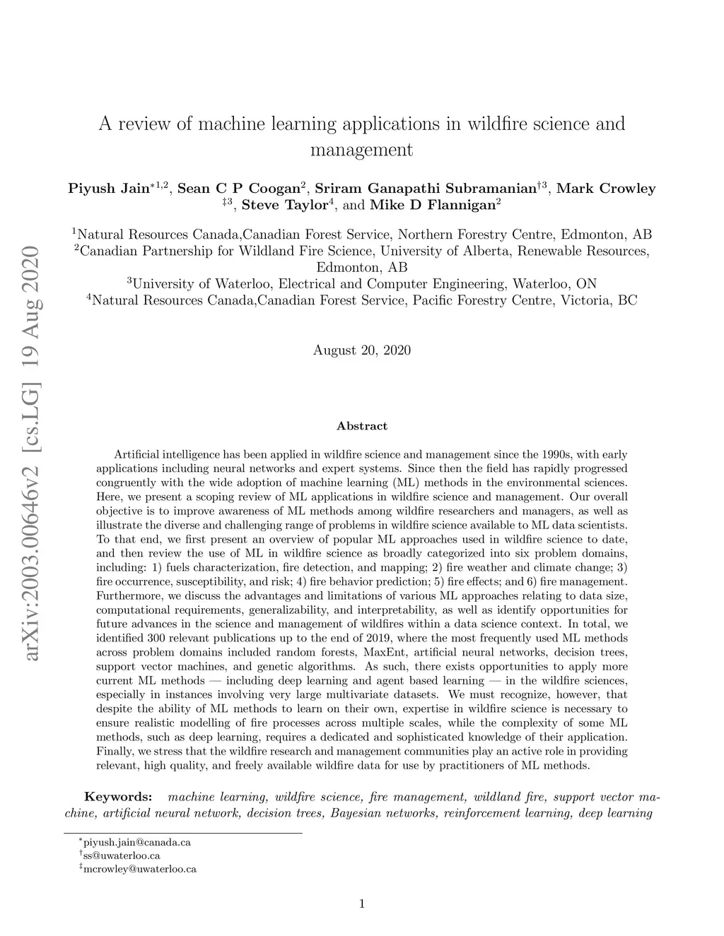 Artificial intelligence has been applied in wildfire science and management since the 1990s, with early applications including neural networks and expert systems. Since then the field has rapidly progressed congruently with the wide adoption of machine learning (ML) in the environmental sciences. Here, we present a scoping review of ML in wildfire science and management. Our objective is to improve awareness of ML among wildfire scientists and managers, as well as illustrate the challenging range of problems in wildfire science available to data scientists. We first present an overview of popular ML approaches used in wildfire science to date, and then review their use in wildfire science within six problem domains: 1) fuels characterization, fire detection, and mapping; 2) fire weather and climate change; 3) fire occurrence, susceptibility, and risk; 4) fire behavior prediction; 5) fire effects; and 6) fire management. We also discuss the advantages and limitations of various ML approaches and identify opportunities for future advances in wildfire science and management within a data science context. We identified 298 relevant publications, where the most frequently used ML methods included random forests, MaxEnt, artificial neural networks, decision trees, support vector machines, and genetic algorithms. There exists opportunities to apply more current ML methods (e.g., deep learning and agent based learning) in wildfire science. However, despite the ability of ML models to learn on their own, expertise in wildfire science is necessary to ensure realistic modelling of fire processes across multiple scales, while the complexity of some ML methods requires sophisticated knowledge for their application. Finally, we stress that the wildfire research and management community plays an active role in providing relevant, high quality data for use by practitioners of ML methods.