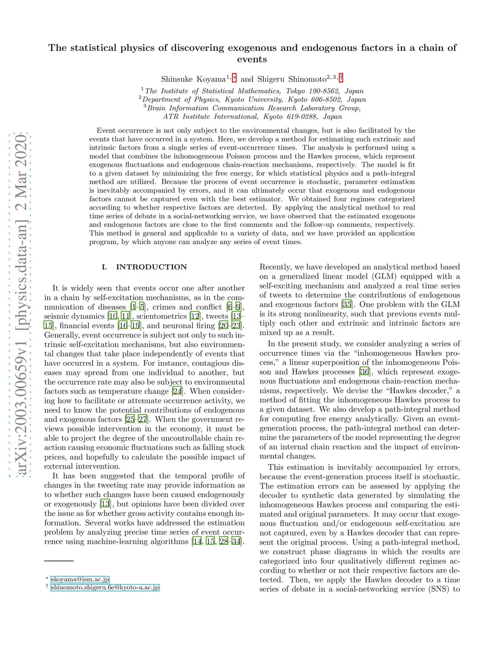 Event occurrence is not only subject to the environmental changes, but is also facilitated by the events that have occurred in a system. Here, we develop a method for estimating such extrinsic and intrinsic factors from a single series of event-occurrence times. The analysis is performed using a model that combines the inhomogeneous Poisson process and the Hawkes process, which represent exogenous fluctuations and endogenous chain-reaction mechanisms, respectively. The model is fit to a given dataset by minimizing the free energy, for which statistical physics and a path-integral method are utilized. Because the process of event occurrence is stochastic, parameter estimation is inevitably accompanied by errors, and it can ultimately occur that exogenous and endogenous factors cannot be captured even with the best estimator. We obtained four regimes categorized according to whether respective factors are detected. By applying the analytical method to real time series of debate in a social-networking service, we have observed that the estimated exogenous and endogenous factors are close to the first comments and the follow-up comments, respectively. This method is general and applicable to a variety of data, and we have provided an application program, by which anyone can analyze any series of event times.