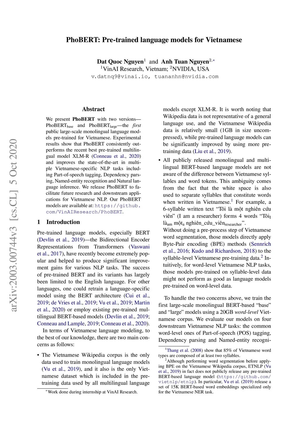 We present PhoBERT with two versions, PhoBERT-base and PhoBERT-large, the first public large-scale monolingual language models pre-trained for Vietnamese. Experimental results show that PhoBERT consistently outperforms the recent best pre-trained multilingual model XLM-R (Conneau et al., 2020) and improves the state-of-the-art in multiple Vietnamese-specific NLP tasks including Part-of-speech tagging, Dependency parsing, Named-entity recognition and Natural language inference. We release PhoBERT to facilitate future research and downstream applications for Vietnamese NLP. Our PhoBERT models are available at https://github.com/VinAIResearch/PhoBERT