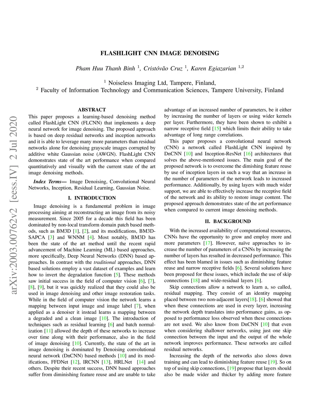 This paper proposes a learning-based denoising method called FlashLight CNN (FLCNN) that implements a deep neural network for image denoising. The proposed approach is based on deep residual networks and inception networks and it is able to leverage many more parameters than residual networks alone for denoising grayscale images corrupted by additive white Gaussian noise (AWGN). FlashLight CNN demonstrates state of the art performance when compared quantitatively and visually with the current state of the art image denoising methods.