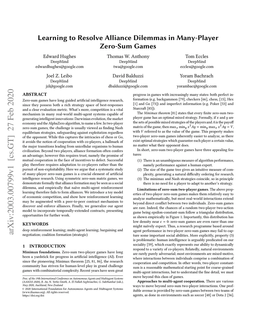 Zero-sum games have long guided artificial intelligence research, since they possess both a rich strategy space of best-responses and a clear evaluation metric. What's more, competition is a vital mechanism in many real-world multi-agent systems capable of generating intelligent innovations: Darwinian evolution, the market economy and the AlphaZero algorithm, to name a few. In two-player zero-sum games, the challenge is usually viewed as finding Nash equilibrium strategies, safeguarding against exploitation regardless of the opponent. While this captures the intricacies of chess or Go, it avoids the notion of cooperation with co-players, a hallmark of the major transitions leading from unicellular organisms to human civilization. Beyond two players, alliance formation often confers an advantage; however this requires trust, namely the promise of mutual cooperation in the face of incentives to defect. Successful play therefore requires adaptation to co-players rather than the pursuit of non-exploitability. Here we argue that a systematic study of many-player zero-sum games is a crucial element of artificial intelligence research. Using symmetric zero-sum matrix games, we demonstrate formally that alliance formation may be seen as a social dilemma, and empirically that na\"ive multi-agent reinforcement learning therefore fails to form alliances. We introduce a toy model of economic competition, and show how reinforcement learning may be augmented with a peer-to-peer contract mechanism to discover and enforce alliances. Finally, we generalize our agent model to incorporate temporally-extended contracts, presenting opportunities for further work.
