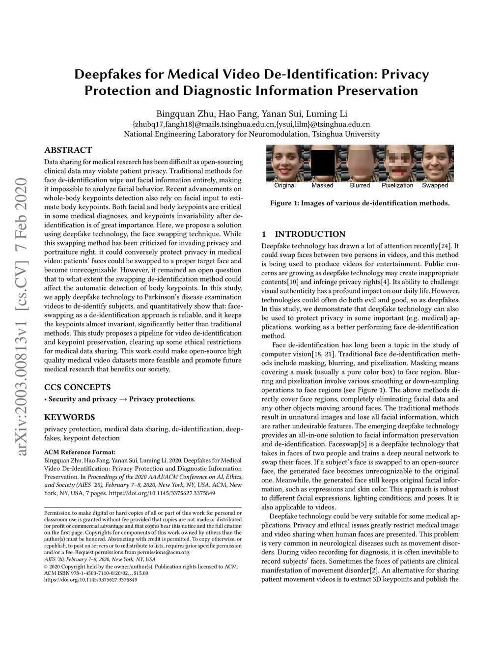 Data sharing for medical research has been difficult as open-sourcing clinical data may violate patient privacy. Traditional methods for face de-identification wipe out facial information entirely, making it impossible to analyze facial behavior. Recent advancements on whole-body keypoints detection also rely on facial input to estimate body keypoints. Both facial and body keypoints are critical in some medical diagnoses, and keypoints invariability after de-identification is of great importance. Here, we propose a solution using deepfake technology, the face swapping technique. While this swapping method has been criticized for invading privacy and portraiture right, it could conversely protect privacy in medical video: patients' faces could be swapped to a proper target face and become unrecognizable. However, it remained an open question that to what extent the swapping de-identification method could affect the automatic detection of body keypoints. In this study, we apply deepfake technology to Parkinson's disease examination videos to de-identify subjects, and quantitatively show that: face-swapping as a de-identification approach is reliable, and it keeps the keypoints almost invariant, significantly better than traditional methods. This study proposes a pipeline for video de-identification and keypoint preservation, clearing up some ethical restrictions for medical data sharing. This work could make open-source high quality medical video datasets more feasible and promote future medical research that benefits our society.