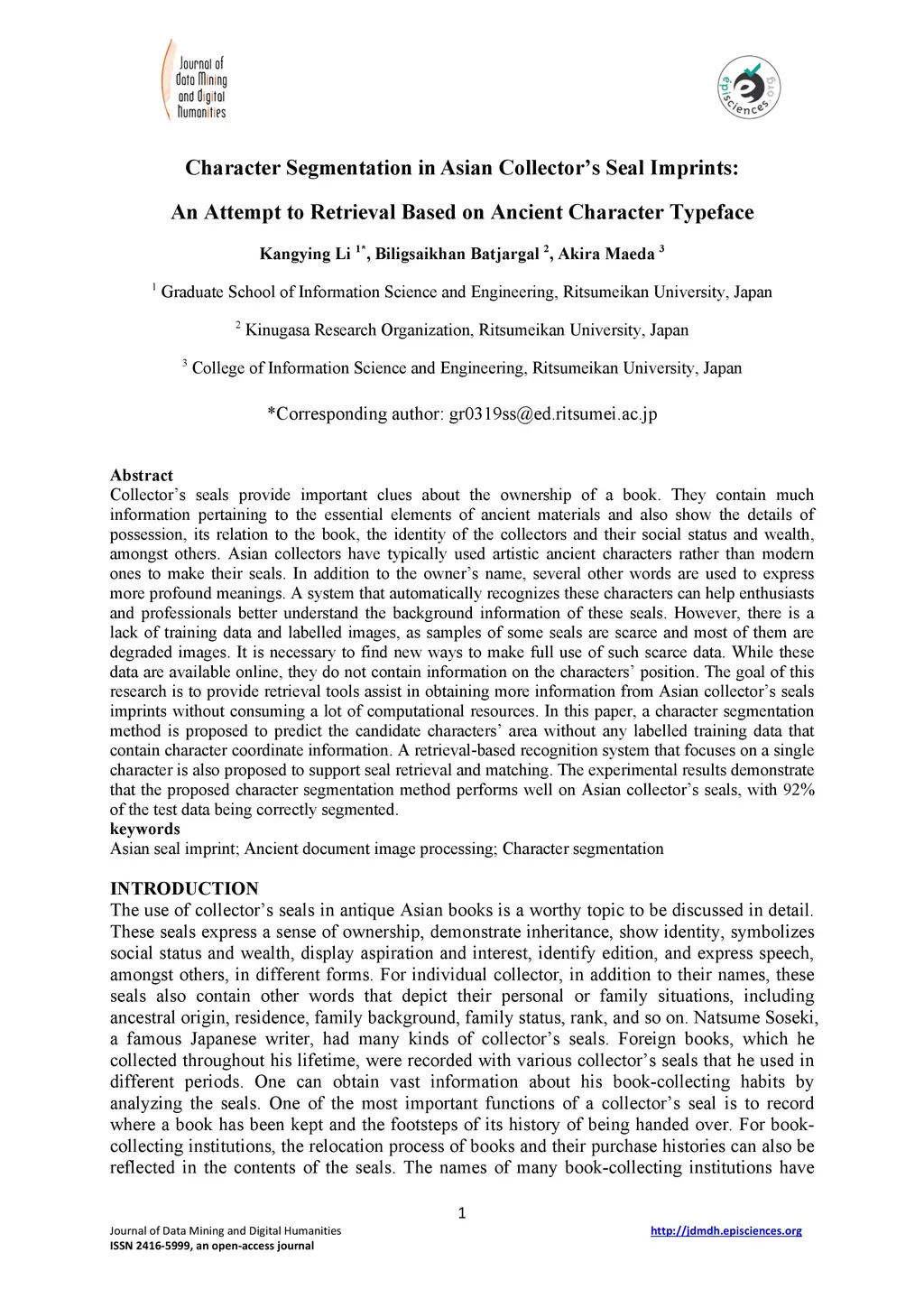 Collector's seals provide important clues about the ownership of a book. They contain much information pertaining to the essential elements of ancient materials and also show the details of possession, its relation to the book, the identity of the collectors and their social status and wealth, amongst others. Asian collectors have typically used artistic ancient characters rather than modern ones to make their seals. In addition to the owner's name, several other words are used to express more profound meanings. A system that automatically recognizes these characters can help enthusiasts and professionals better understand the background information of these seals. However, there is a lack of training data and labelled images, as samples of some seals are scarce and most of them are degraded images. It is necessary to find new ways to make full use of such scarce data. While these data are available online, they do not contain information on the characters'position. The goal of this research is to provide retrieval tools assist in obtaining more information from Asian collector's seals imprints without consuming a lot of computational resources. In this paper, a character segmentation method is proposed to predict the candidate charactersárea without any labelled training data that contain character coordinate information. A retrieval-based recognition system that focuses on a single character is also proposed to support seal retrieval and matching. The experimental results demonstrate that the proposed character segmentation method performs well on Asian collector's seals, with 92% of the test data being correctly segmented.