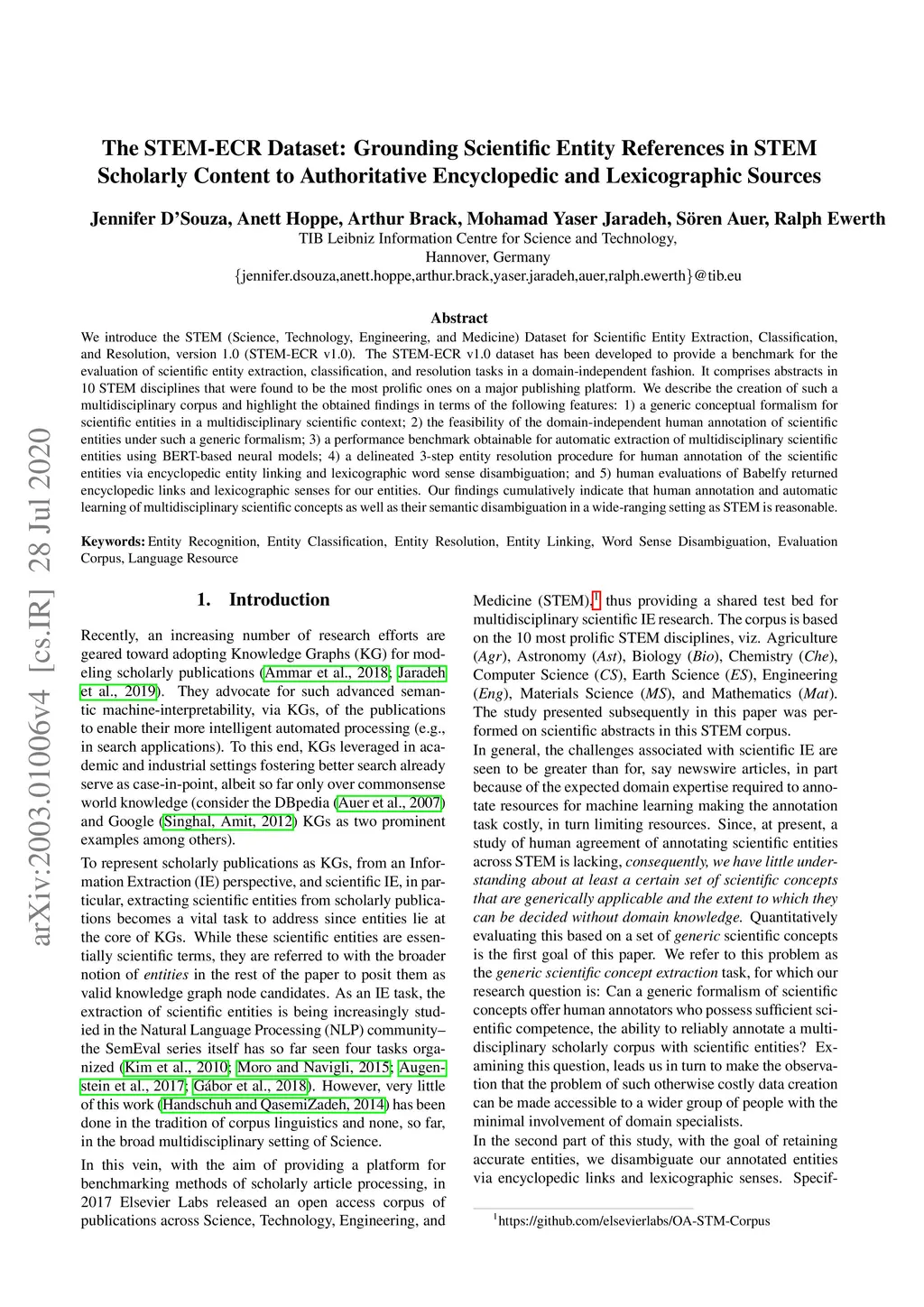 We introduce the STEM (Science, Technology, Engineering, and Medicine) Dataset for Scientific Entity Extraction, Classification, and Resolution, version 1.0 (STEM-ECR v1.0). The STEM-ECR v1.0 dataset has been developed to provide a benchmark for the evaluation of scientific entity extraction, classification, and resolution tasks in a domain-independent fashion. It comprises abstracts in 10 STEM disciplines that were found to be the most prolific ones on a major publishing platform. We describe the creation of such a multidisciplinary corpus and highlight the obtained findings in terms of the following features: 1) a generic conceptual formalism for scientific entities in a multidisciplinary scientific context; 2) the feasibility of the domain-independent human annotation of scientific entities under such a generic formalism; 3) a performance benchmark obtainable for automatic extraction of multidisciplinary scientific entities using BERT-based neural models; 4) a delineated 3-step entity resolution procedure for human annotation of the scientific entities via encyclopedic entity linking and lexicographic word sense disambiguation; and 5) human evaluations of Babelfy returned encyclopedic links and lexicographic senses for our entities. Our findings cumulatively indicate that human annotation and automatic learning of multidisciplinary scientific concepts as well as their semantic disambiguation in a wide-ranging setting as STEM is reasonable.