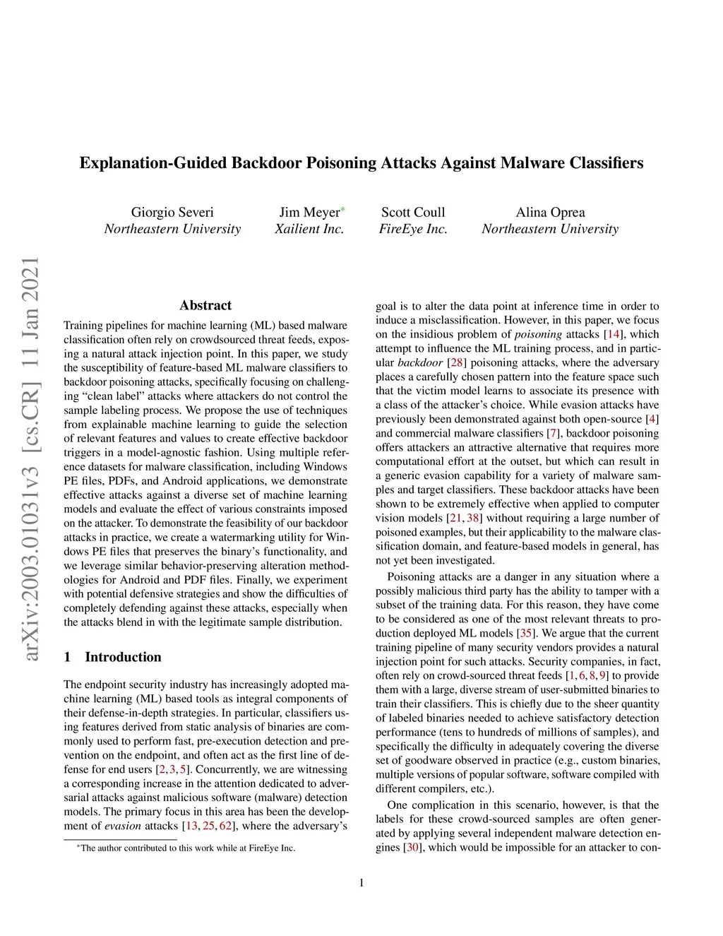 Training pipelines for machine learning (ML) based malware classification often rely on crowdsourced threat feeds, exposing a natural attack injection point. In this paper, we study the susceptibility of feature-based ML malware classifiers to backdoor poisoning attacks, specifically focusing on challenging "clean label" attacks where attackers do not control the sample labeling process. We propose the use of techniques from explainable machine learning to guide the selection of relevant features and values to create effective backdoor triggers in a model-agnostic fashion. Using multiple reference datasets for malware classification, including Windows PE files, PDFs, and Android applications, we demonstrate effective attacks against a diverse set of machine learning models and evaluate the effect of various constraints imposed on the attacker. To demonstrate the feasibility of our backdoor attacks in practice, we create a watermarking utility for Windows PE files that preserves the binary's functionality, and we leverage similar behavior-preserving alteration methodologies for Android and PDF files. Finally, we experiment with potential defensive strategies and show the difficulties of completely defending against these attacks, especially when the attacks blend in with the legitimate sample distribution.