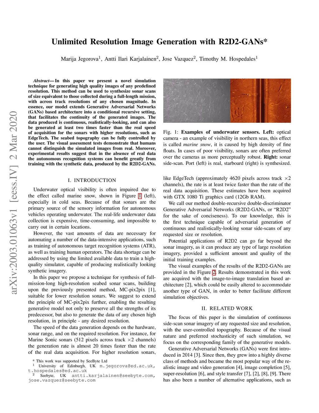 In this paper we present a novel simulation technique for generating high quality images of any predefined resolution. This method can be used to synthesize sonar scans of size equivalent to those collected during a full-length mission, with across track resolutions of any chosen magnitude. In essence, our model extends Generative Adversarial Networks (GANs) based architecture into a conditional recursive setting, that facilitates the continuity of the generated images. The data produced is continuous, realistically-looking, and can also be generated at least two times faster than the real speed of acquisition for the sonars with higher resolutions, such as EdgeTech. The seabed topography can be fully controlled by the user. The visual assessment tests demonstrate that humans cannot distinguish the simulated images from real. Moreover, experimental results suggest that in the absence of real data the autonomous recognition systems can benefit greatly from training with the synthetic data, produced by the R2D2-GANs.