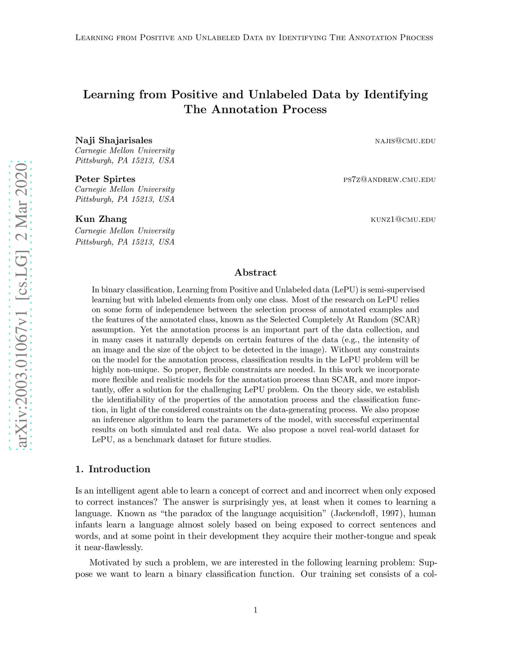 In binary classification, Learning from Positive and Unlabeled data (LePU) is semi-supervised learning but with labeled elements from only one class. Most of the research on LePU relies on some form of independence between the selection process of annotated examples and the features of the annotated class, known as the Selected Completely At Random (SCAR) assumption. Yet the annotation process is an important part of the data collection, and in many cases it naturally depends on certain features of the data (e.g., the intensity of an image and the size of the object to be detected in the image). Without any constraints on the model for the annotation process, classification results in the LePU problem will be highly non-unique. So proper, flexible constraints are needed. In this work we incorporate more flexible and realistic models for the annotation process than SCAR, and more importantly, offer a solution for the challenging LePU problem. On the theory side, we establish the identifiability of the properties of the annotation process and the classification function, in light of the considered constraints on the data-generating process. We also propose an inference algorithm to learn the parameters of the model, with successful experimental results on both simulated and real data. We also propose a novel real-world dataset forLePU, as a benchmark dataset for future studies.
