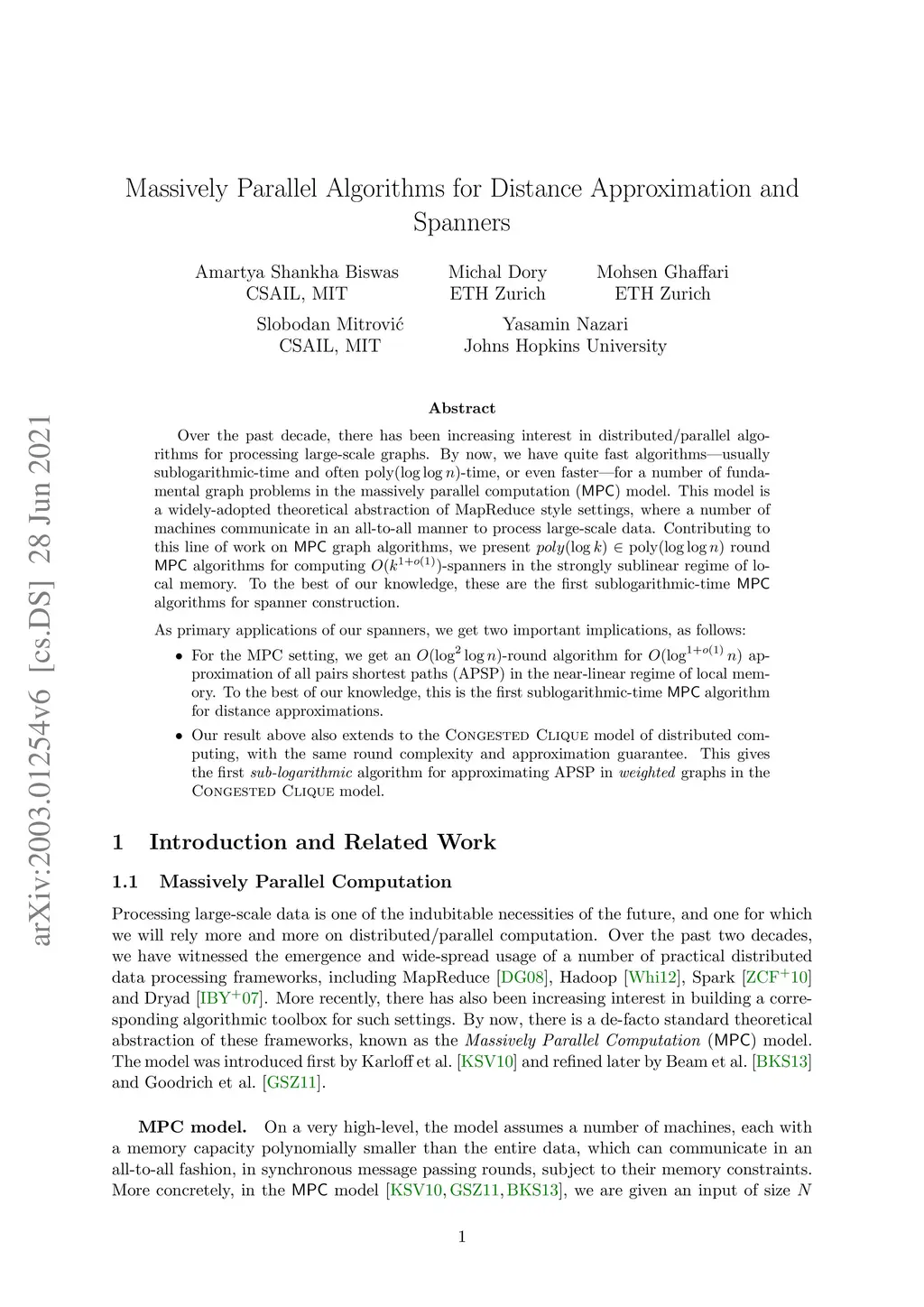 Over the past decade, there has been increasing interest in distributed/parallel algorithms for processing large-scale graphs. By now, we have quite fast algorithms -- usually sublogarithmic-time and often -time, or even faster -- for a number of fundamental graph problems in the massively parallel computation (MPC) model. This model is a widely-adopted theoretical abstraction of MapReduce style settings, where a number of machines communicate in an all-to-all manner to process large-scale data. Contributing to this line of work on MPC graph algorithms, we present round MPC algorithms for computing -spanners in the strongly sublinear regime of local memory. To the best of our knowledge, these are the first sublogarithmic-time MPC algorithms for spanner construction. As primary applications of our spanners, we get two important implications, as follows: -For the MPC setting, we get an -round algorithm for approximation of all pairs shortest paths (APSP) in the near-linear regime of local memory. To the best of our knowledge, this is the first sublogarithmic-time MPC algorithm for distance approximations. -Our result above also extends to the Congested Clique model of distributed computing, with the same round complexity and approximation guarantee. This gives the first sub-logarithmic algorithm for approximating APSP in weighted graphs in the Congested Clique model.