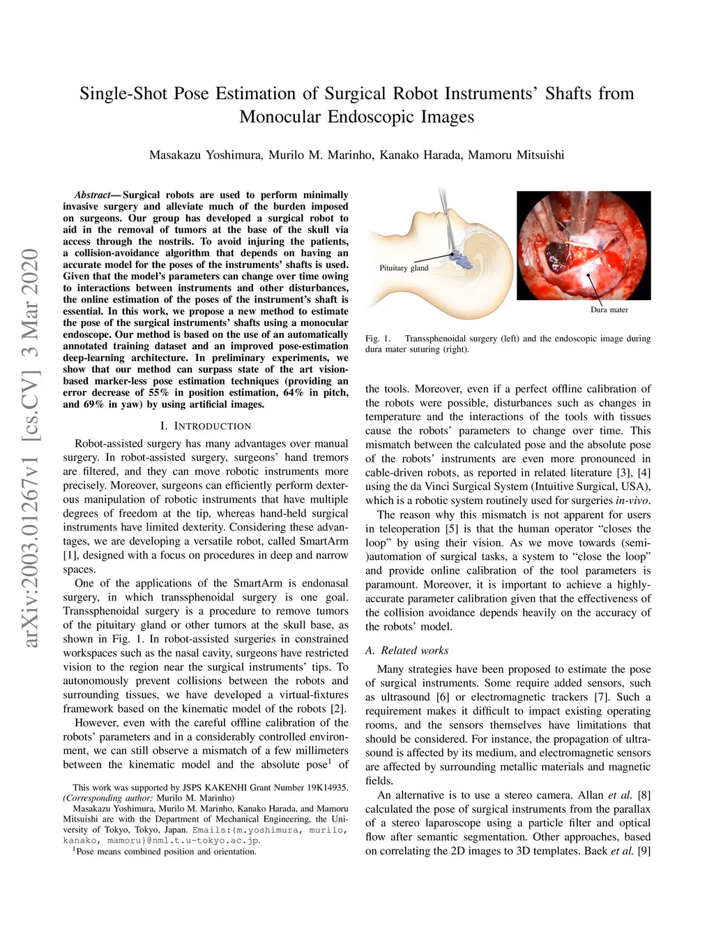 Surgical robots are used to perform minimally invasive surgery and alleviate much of the burden imposed on surgeons. Our group has developed a surgical robot to aid in the removal of tumors at the base of the skull via access through the nostrils. To avoid injuring the patients, a collision-avoidance algorithm that depends on having an accurate model for the poses of the instruments' shafts is used. Given that the model's parameters can change over time owing to interactions between instruments and other disturbances, the online estimation of the poses of the instrument's shaft is essential. In this work, we propose a new method to estimate the pose of the surgical instruments' shafts using a monocular endoscope. Our method is based on the use of an automatically annotated training dataset and an improved pose-estimation deep-learning architecture. In preliminary experiments, we show that our method can surpass state of the art vision-based marker-less pose estimation techniques (providing an error decrease of 55% in position estimation, 64% in pitch, and 69% in yaw) by using artificial images.