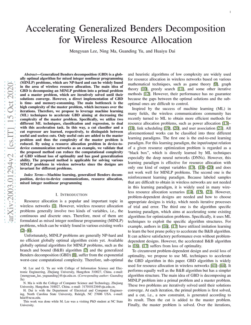 Generalized Benders decomposition (GBD) is a globally optimal algorithm for mixed integer nonlinear programming (MINLP) problems, which are NP-hard and can be widely found in the area of wireless resource allocation. The main idea of GBD is decomposing an MINLP problem into a primal problem and a master problem, which are iteratively solved until their solutions converge. However, a direct implementation of GBD is time- and memory-consuming. The main bottleneck is the high complexity of the master problem, which increases over the iterations. Therefore, we propose to leverage machine learning (ML) techniques to accelerate GBD aiming at decreasing the complexity of the master problem. Specifically, we utilize two different ML techniques, classification and regression, to deal with this acceleration task. In this way, a cut classifier and a cut regressor are learned, respectively, to distinguish between useful and useless cuts. Only useful cuts are added to the master problem and thus the complexity of the master problem is reduced. By using a resource allocation problem in device-to-device communication networks as an example, we validate that the proposed method can reduce the computational complexity of GBD without loss of optimality and has strong generalization ability. The proposed method is applicable for solving various MINLP problems in wireless networks since the designs are invariant for different problems.