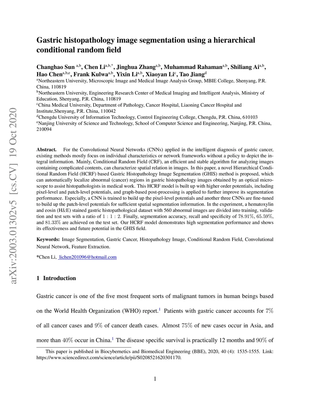 For the Convolutional Neural Networks (CNNs) applied in the intelligent diagnosis of gastric cancer, existing methods mostly focus on individual characteristics or network frameworks without a policy to depict the integral information. Mainly, Conditional Random Field (CRF), an efficient and stable algorithm for analyzing images containing complicated contents, can characterize spatial relation in images. In this paper, a novel Hierarchical Conditional Random Field (HCRF) based Gastric Histopathology Image Segmentation (GHIS) method is proposed, which can automatically localize abnormal (cancer) regions in gastric histopathology images obtained by an optical microscope to assist histopathologists in medical work. This HCRF model is built up with higher order potentials, including pixel-level and patch-level potentials, and graph-based post-processing is applied to further improve its segmentation performance. Especially, a CNN is trained to build up the pixel-level potentials and another three CNNs are fine-tuned to build up the patch-level potentials for sufficient spatial segmentation information. In the experiment, a hematoxylin and eosin (H&E) stained gastric histopathological dataset with 560 abnormal images are divided into training, validation and test sets with a ratio of 1 : 1 : 2. Finally, segmentation accuracy, recall and specificity of 78.91%, 65.59%, and 81.33% are achieved on the test set. Our HCRF model demonstrates high segmentation performance and shows its effectiveness and future potential in the GHIS field.