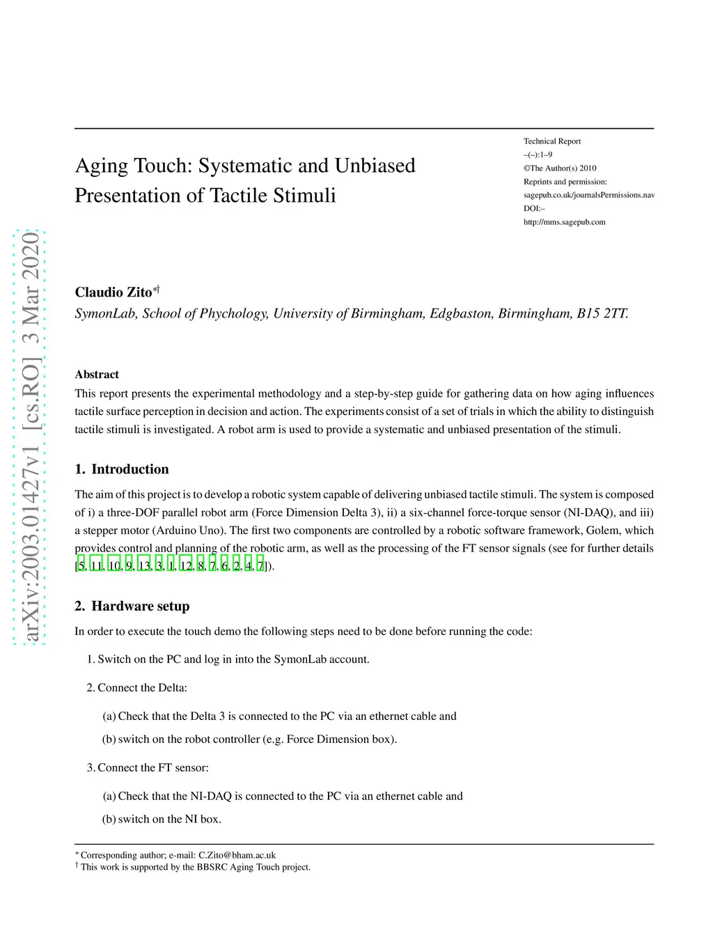 This report presents the experimental methodology and a step-by-step guide for gathering data on how aging influences tactile surface perception in decision and action. The experiments consist of a set of trials in which the ability to distinguish tactile stimuli is investigated. A robot arm is used to provide a systematic and unbiased presentation of the stimuli.