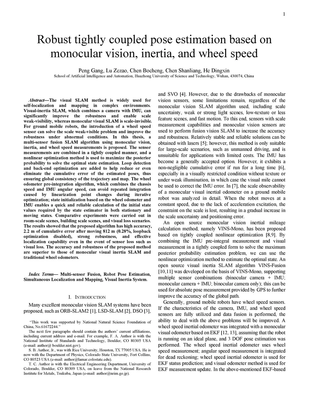 The visual SLAM method is widely used for self-localization and mapping in complex environments. Visual-inertia SLAM, which combines a camera with IMU, can significantly improve the robustness and enable scale weak-visibility, whereas monocular visual SLAM is scale-invisible. For ground mobile robots, the introduction of a wheel speed sensor can solve the scale weak-visible problem and improve the robustness under abnormal conditions. In this thesis, a multi-sensor fusion SLAM algorithm using monocular vision, inertia, and wheel speed measurements is proposed. The sensor measurements are combined in a tightly coupled manner, and a nonlinear optimization method is used to maximize the posterior probability to solve the optimal state estimation. Loop detection and back-end optimization are added to help reduce or even eliminate the cumulative error of the estimated poses, thus ensuring global consistency of the trajectory and map. The wheel odometer pre-integration algorithm, which combines the chassis speed and IMU angular speed, can avoid repeated integration caused by linearization point changes during iterative optimization; state initialization based on the wheel odometer and IMU enables a quick and reliable calculation of the initial state values required by the state estimator in both stationary and moving states. Comparative experiments were carried out in room-scale scenes, building scale scenes, and visual loss scenarios. The results showed that the proposed algorithm has high accuracy, 2.2 m of cumulative error after moving 812 m (0.28%, loopback optimization disabled), strong robustness, and effective localization capability even in the event of sensor loss such as visual loss. The accuracy and robustness of the proposed method are superior to those of monocular visual inertia SLAM and traditional wheel odometers.