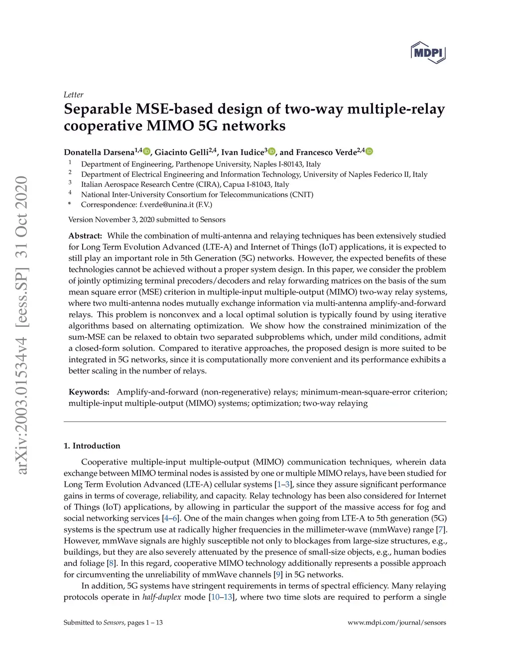 Separable MSE-based design of two-way multiple-relay cooperative MIMO 5G