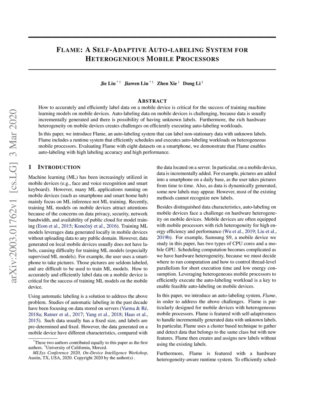 How to accurately and efficiently label data on a mobile device is critical for the success of training machine learning models on mobile devices. Auto-labeling data on mobile devices is challenging, because data is usually incrementally generated and there is possibility of having unknown labels. Furthermore, the rich hardware heterogeneity on mobile devices creates challenges on efficiently executing auto-labeling workloads. In this paper, we introduce Flame, an auto-labeling system that can label non-stationary data with unknown labels. Flame includes a runtime system that efficiently schedules and executes auto-labeling workloads on heterogeneous mobile processors. Evaluating Flame with eight datasets on a smartphone, we demonstrate that Flame enables auto-labeling with high labeling accuracy and high performance.