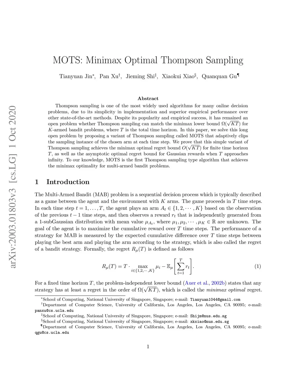 Thompson sampling is one of the most widely used algorithms for many online decision problems, due to its simplicity in implementation and superior empirical performance over other state-of-the-art methods. Despite its popularity and empirical success, it has remained an open problem whether Thompson sampling can match the minimax lower bound for -armed bandit problems, where is the total time horizon. In this paper, we solve this long open problem by proposing a variant of Thompson sampling called MOTS that adaptively clips the sampling instance of the chosen arm at each time step. We prove that this simple variant of Thompson sampling achieves the minimax optimal regret bound for finite time horizon , as well as the asymptotic optimal regret bound for Gaussian rewards when approaches infinity. To our knowledge, MOTS is the first Thompson sampling type algorithm that achieves the minimax optimality for multi-armed bandit problems.