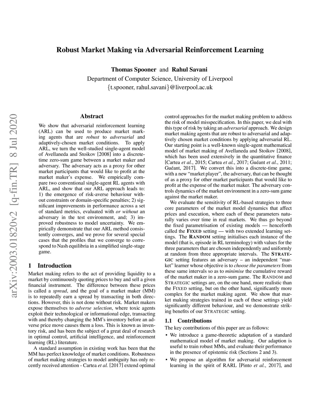 We show that adversarial reinforcement learning (ARL) can be used to produce market marking agents that are robust to adversarial and adaptively-chosen market conditions. To apply ARL, we turn the well-studied single-agent model of Avellaneda and Stoikov [2008] into a discrete-time zero-sum game between a market maker and adversary. The adversary acts as a proxy for other market participants that would like to profit at the market maker's expense. We empirically compare two conventional single-agent RL agents with ARL, and show that our ARL approach leads to: 1) the emergence of risk-averse behaviour without constraints or domain-specific penalties; 2) significant improvements in performance across a set of standard metrics, evaluated with or without an adversary in the test environment, and; 3) improved robustness to model uncertainty. We empirically demonstrate that our ARL method consistently converges, and we prove for several special cases that the profiles that we converge to correspond to Nash equilibria in a simplified single-stage game.