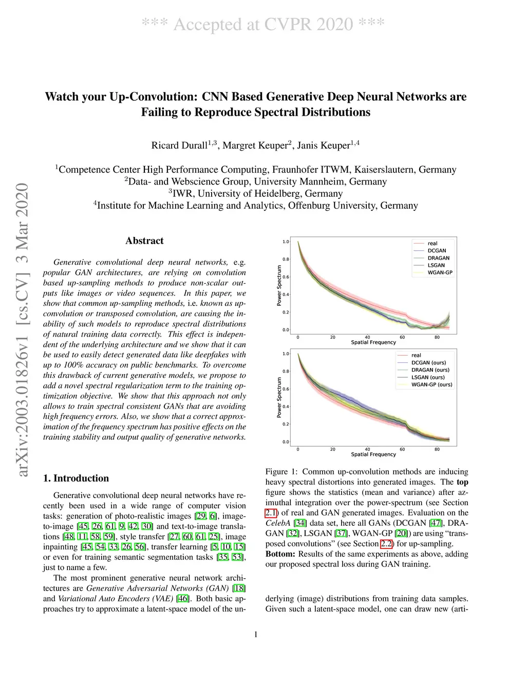 Generative convolutional deep neural networks, e.g. popular GAN architectures, are relying on convolution based up-sampling methods to produce non-scalar outputs like images or video sequences. In this paper, we show that common up-sampling methods, i.e. known as up-convolution or transposed convolution, are causing the inability of such models to reproduce spectral distributions of natural training data correctly. This effect is independent of the underlying architecture and we show that it can be used to easily detect generated data like deepfakes with up to 100% accuracy on public benchmarks. To overcome this drawback of current generative models, we propose to add a novel spectral regularization term to the training optimization objective. We show that this approach not only allows to train spectral consistent GANs that are avoiding high frequency errors. Also, we show that a correct approximation of the frequency spectrum has positive effects on the training stability and output quality of generative networks.