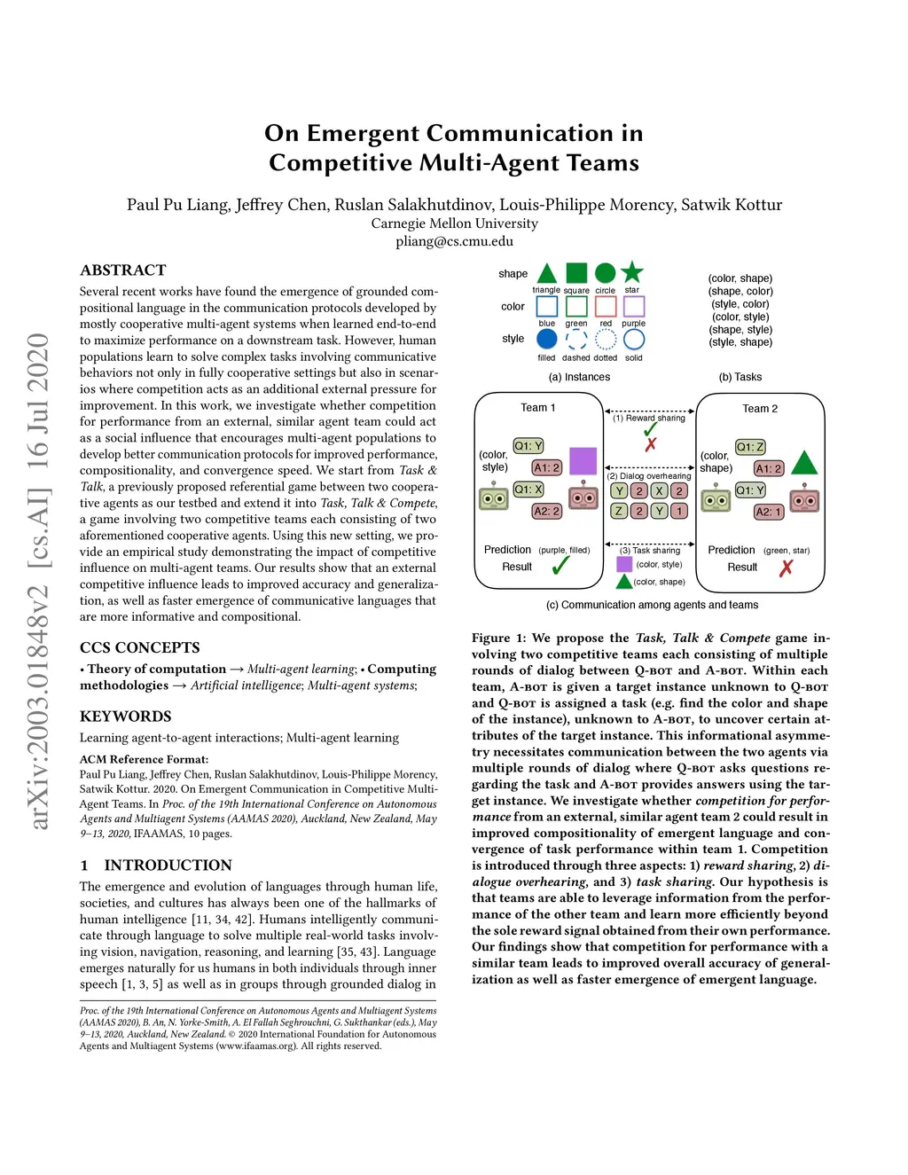 Several recent works have found the emergence of grounded compositional language in the communication protocols developed by mostly cooperative multi-agent systems when learned end-to-end to maximize performance on a downstream task. However, human populations learn to solve complex tasks involving communicative behaviors not only in fully cooperative settings but also in scenarios where competition acts as an additional external pressure for improvement. In this work, we investigate whether competition for performance from an external, similar agent team could act as a social influence that encourages multi-agent populations to develop better communication protocols for improved performance, compositionality, and convergence speed. We start from Task & Talk, a previously proposed referential game between two cooperative agents as our testbed and extend it into Task, Talk & Compete, a game involving two competitive teams each consisting of two aforementioned cooperative agents. Using this new setting, we provide an empirical study demonstrating the impact of competitive influence on multi-agent teams. Our results show that an external competitive influence leads to improved accuracy and generalization, as well as faster emergence of communicative languages that are more informative and compositional.