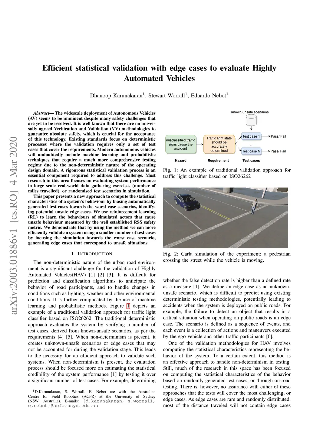 The widescale deployment of Autonomous Vehicles (AV) seems to be imminent despite many safety challenges that are yet to be resolved. It is well known that there are no universally agreed Verification and Validation (VV) methodologies to guarantee absolute safety, which is crucial for the acceptance of this technology. Existing standards focus on deterministic processes where the validation requires only a set of test cases that cover the requirements. Modern autonomous vehicles will undoubtedly include machine learning and probabilistic techniques that require a much more comprehensive testing regime due to the non-deterministic nature of the operating design domain. A rigourous statistical validation process is an essential component required to address this challenge. Most research in this area focuses on evaluating system performance in large scale real-world data gathering exercises (number of miles travelled), or randomised test scenarios in simulation. This paper presents a new approach to compute the statistical characteristics of a system's behaviour by biasing automatically generated test cases towards the worst case scenarios, identifying potential unsafe edge cases.We use reinforcement learning (RL) to learn the behaviours of simulated actors that cause unsafe behaviour measured by the well established RSS safety metric. We demonstrate that by using the method we can more efficiently validate a system using a smaller number of test cases by focusing the simulation towards the worst case scenario, generating edge cases that correspond to unsafe situations.