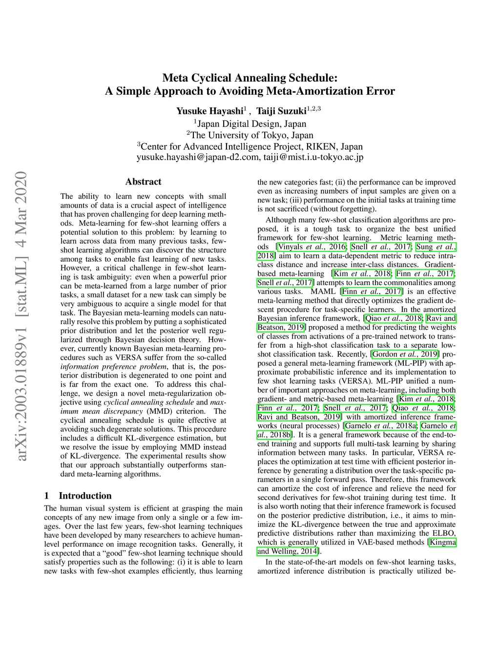 The ability to learn new concepts with small amounts of data is a crucial aspect of intelligence that has proven challenging for deep learning methods. Meta-learning for few-shot learning offers a potential solution to this problem: by learning to learn across data from many previous tasks, few-shot learning algorithms can discover the structure among tasks to enable fast learning of new tasks. However, a critical challenge in few-shot learning is task ambiguity: even when a powerful prior can be meta-learned from a large number of prior tasks, a small dataset for a new task can simply be very ambiguous to acquire a single model for that task. The Bayesian meta-learning models can naturally resolve this problem by putting a sophisticated prior distribution and let the posterior well regularized through Bayesian decision theory. However, currently known Bayesian meta-learning procedures such as VERSA suffer from the so-called {\it information preference problem}, that is, the posterior distribution is degenerated to one point and is far from the exact one. To address this challenge, we design a novel meta-regularization objective using {\it cyclical annealing schedule} and {\it maximum mean discrepancy} (MMD) criterion. The cyclical annealing schedule is quite effective at avoiding such degenerate solutions. This procedure includes a difficult KL-divergence estimation, but we resolve the issue by employing MMD instead of KL-divergence. The experimental results show that our approach substantially outperforms standard meta-learning algorithms.
