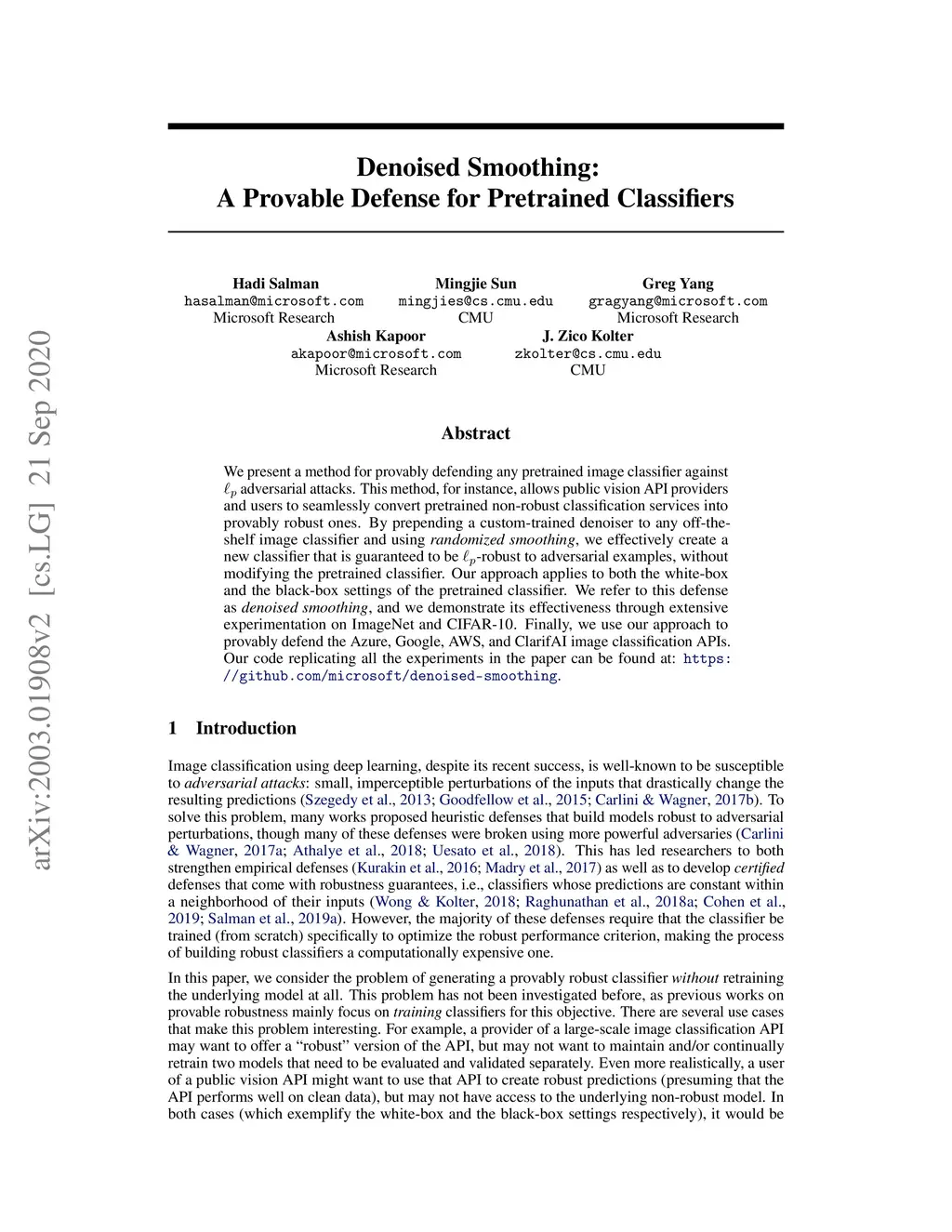 We present a method for provably defending any pretrained image classifier against adversarial attacks. This method, for instance, allows public vision API providers and users to seamlessly convert pretrained non-robust classification services into provably robust ones. By prepending a custom-trained denoiser to any off-the-shelf image classifier and using randomized smoothing, we effectively create a new classifier that is guaranteed to be -robust to adversarial examples, without modifying the pretrained classifier. Our approach applies to both the white-box and the black-box settings of the pretrained classifier. We refer to this defense as denoised smoothing, and we demonstrate its effectiveness through extensive experimentation on ImageNet and CIFAR-10. Finally, we use our approach to provably defend the Azure, Google, AWS, and ClarifAI image classification APIs. Our code replicating all the experiments in the paper can be found at: https://github.com/microsoft/denoised-smoothing.