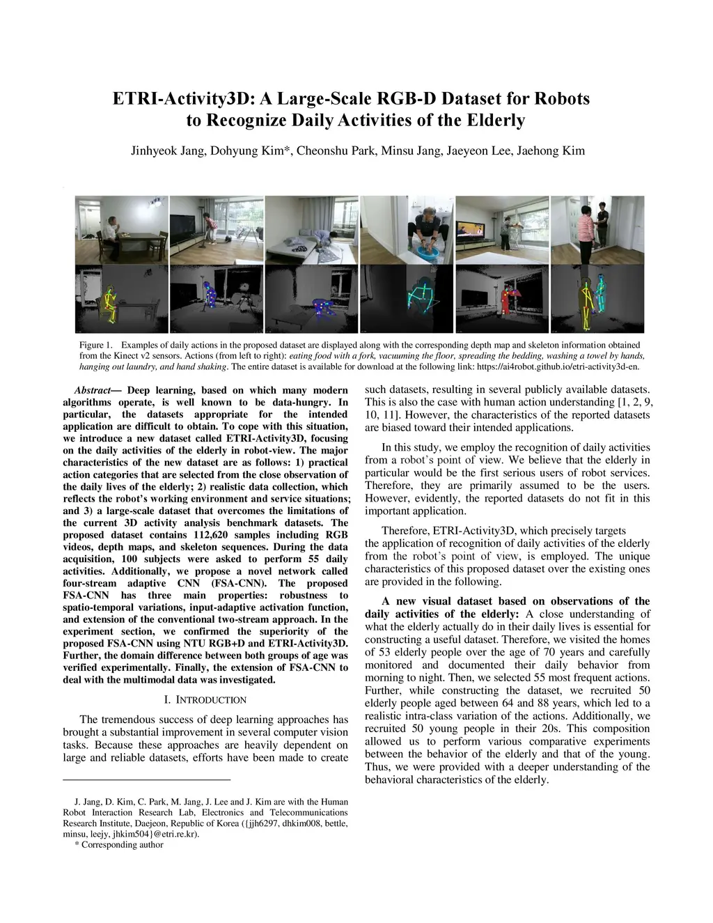 Deep learning, based on which many modern algorithms operate, is well known to be data-hungry. In particular, the datasets appropriate for the intended application are difficult to obtain. To cope with this situation, we introduce a new dataset called ETRI-Activity3D, focusing on the daily activities of the elderly in robot-view. The major characteristics of the new dataset are as follows: 1) practical action categories that are selected from the close observation of the daily lives of the elderly; 2) realistic data collection, which reflects the robot's working environment and service situations; and 3) a large-scale dataset that overcomes the limitations of the current 3D activity analysis benchmark datasets. The proposed dataset contains 112,620 samples including RGB videos, depth maps, and skeleton sequences. During the data acquisition, 100 subjects were asked to perform 55 daily activities. Additionally, we propose a novel network called four-stream adaptive CNN (FSA-CNN). The proposed FSA-CNN has three main properties: robustness to spatio-temporal variations, input-adaptive activation function, and extension of the conventional two-stream approach. In the experiment section, we confirmed the superiority of the proposed FSA-CNN using NTU RGB+D and ETRI-Activity3D. Further, the domain difference between both groups of age was verified experimentally. Finally, the extension of FSA-CNN to deal with the multimodal data was investigated.