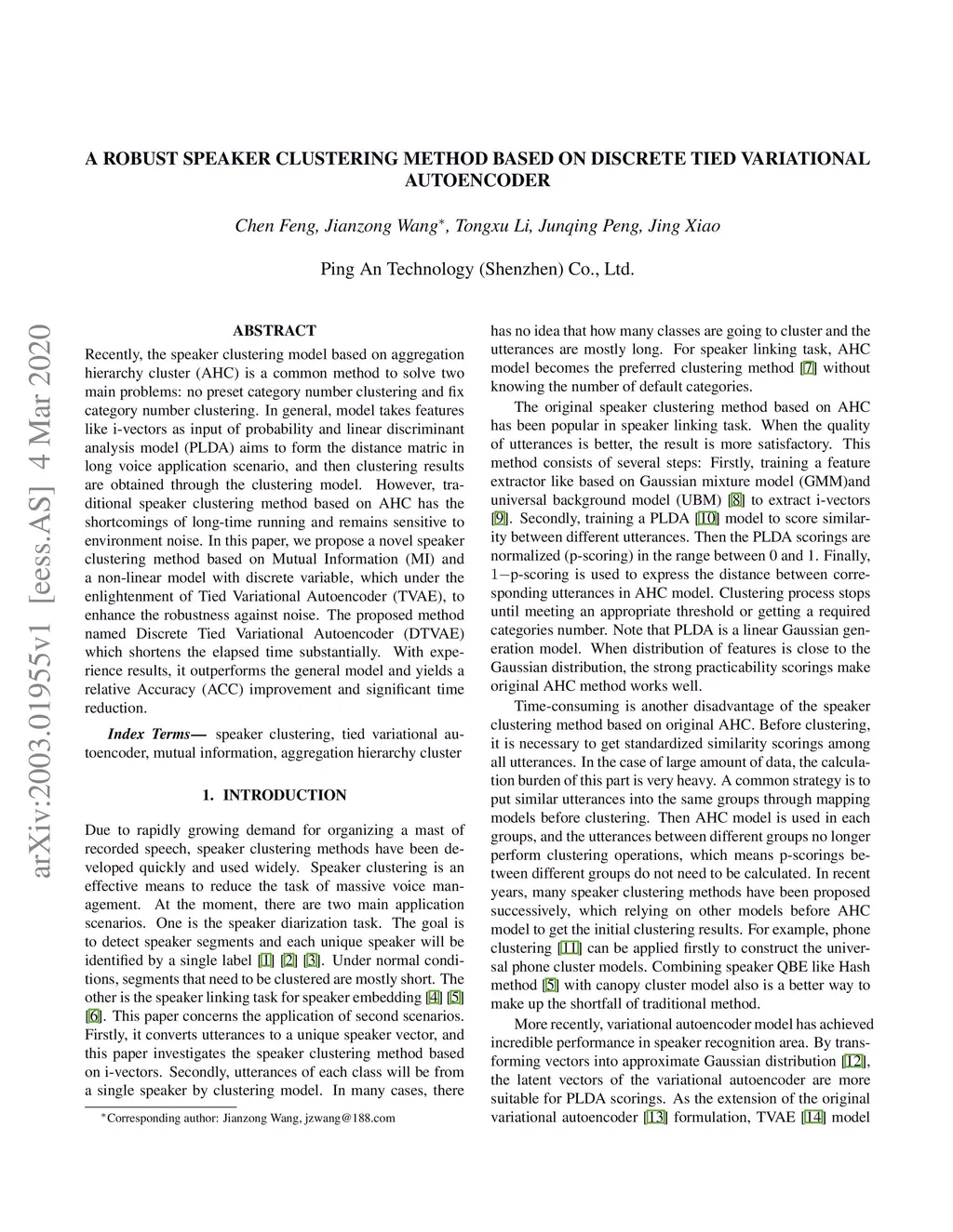 Recently, the speaker clustering model based on aggregation hierarchy cluster (AHC) is a common method to solve two main problems: no preset category number clustering and fix category number clustering. In general, model takes features like i-vectors as input of probability and linear discriminant analysis model (PLDA) aims to form the distance matric in long voice application scenario, and then clustering results are obtained through the clustering model. However, traditional speaker clustering method based on AHC has the shortcomings of long-time running and remains sensitive to environment noise. In this paper, we propose a novel speaker clustering method based on Mutual Information (MI) and a non-linear model with discrete variable, which under the enlightenment of Tied Variational Autoencoder (TVAE), to enhance the robustness against noise. The proposed method named Discrete Tied Variational Autoencoder (DTVAE) which shortens the elapsed time substantially. With experience results, it outperforms the general model and yields a relative Accuracy (ACC) improvement and significant time reduction.