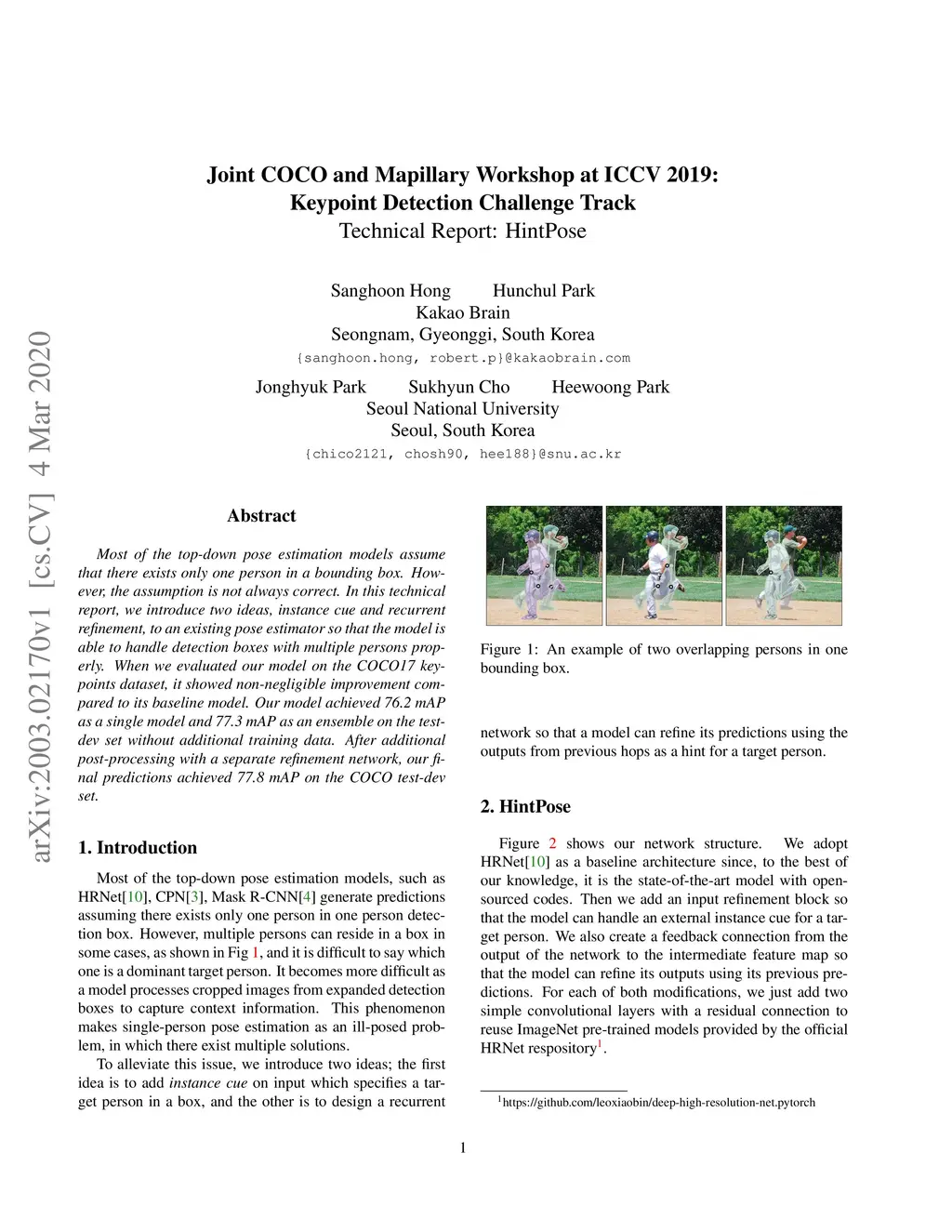 Most of the top-down pose estimation models assume that there exists only one person in a bounding box. However, the assumption is not always correct. In this technical report, we introduce two ideas, instance cue and recurrent refinement, to an existing pose estimator so that the model is able to handle detection boxes with multiple persons properly. When we evaluated our model on the COCO17 keypoints dataset, it showed non-negligible improvement compared to its baseline model. Our model achieved 76.2 mAP as a single model and 77.3 mAP as an ensemble on the test-dev set without additional training data. After additional post-processing with a separate refinement network, our final predictions achieved 77.8 mAP on the COCO test-dev set.