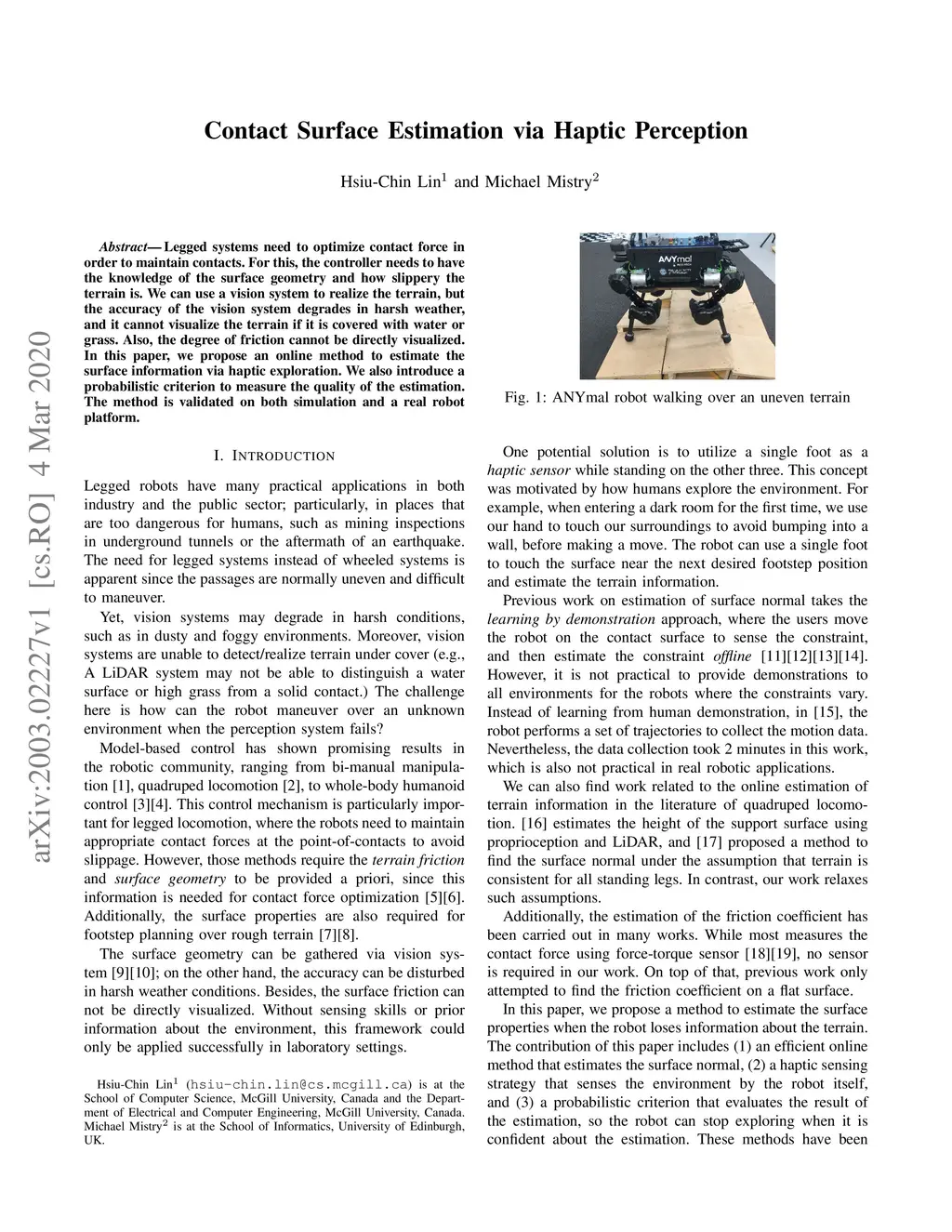 Legged systems need to optimize contact force in order to maintain contacts. For this, the controller needs to have the knowledge of the surface geometry and how slippery the terrain is. We can use a vision system to realize the terrain, but the accuracy of the vision system degrades in harsh weather, and it cannot visualize the terrain if it is covered with water or grass. Also, the degree of friction cannot be directly visualized. In this paper, we propose an online method to estimate the surface information via haptic exploration. We also introduce a probabilistic criterion to measure the quality of the estimation. The method is validated on both simulation and a real robot platform.