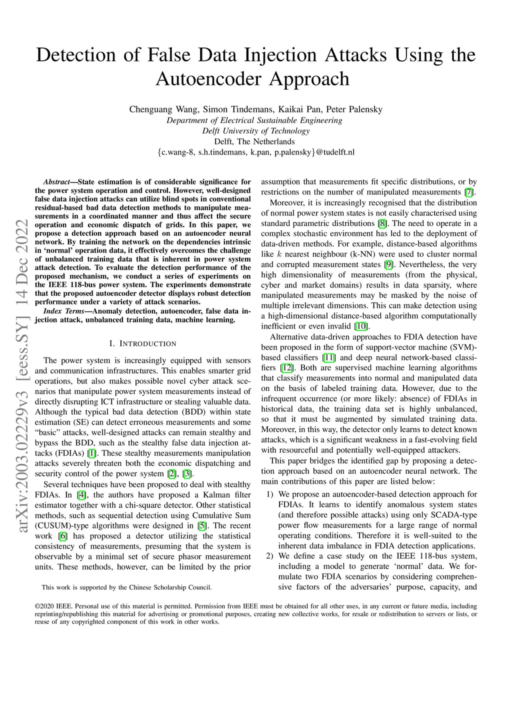 Detection of False Data Injection Attacks Using the Autoencoder Approach